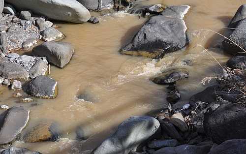 川の水が濁っています。ふふん、きっと上流のどこかで河川工事がおこなわれて
