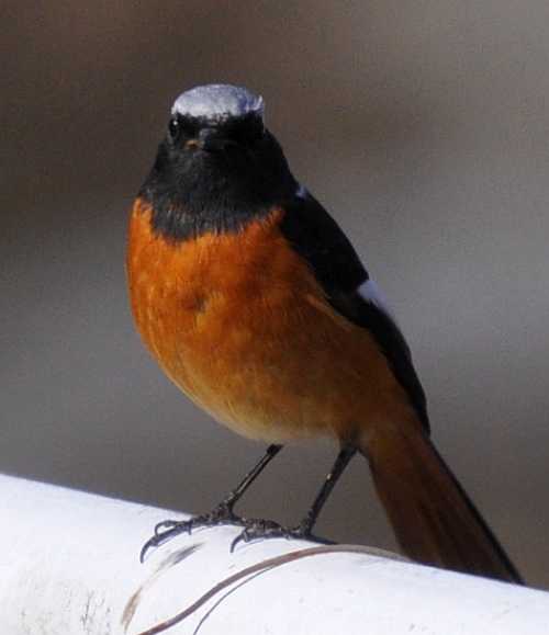 正面顔で、ご対面。オスのジョウビタキさん、ちょっと強面でした。