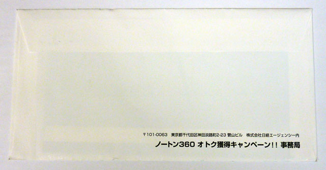 ノートン 360バージョン3.0キャンペーンで3/13に申し込んだキャンペーンでもらえるギフトカードがようやく昨日届きました。こんな封筒に入ってこんな手紙がついて三菱UFJニコスギフトカード合計2,500円分が届きました。3/13から約2ヶ月。 もうこないんじゃないかと忘れかけていた頃に届きました。これで結果的に実質3,500円程度でノートン360バージョン3.0が購入できたことになります。申し込んだけどまだ届いていないという人はそろそろ期待して待っていれば良いようです。ちなみにいまだとノートン360 4.0(3台までに1年間)は7,200円~で販売中です。これも2,000円のキャッシュバックがあるので、いまだと5,200円相当で購入可能となります。