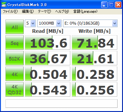 ファン付USB3.0用HDDケース 裸族のインテリジェントビル(CRIB35EU3)にとりあえず2TBのHDD1台を接続して動作確認はすませていましたが、故障が疑わしいNAS LS-Q4.0TL/R5のバックアップのために、もう一台2TBのHDDを購入して、2TB×2の構成で使ってみることにしました。追加購入したのは1台目と同じWD20EASRです。前回と同じソフマップで8,780円で購入しました。WesternDigital 【限定特価】 WD20EARS-00MVWB0 バルク品 (2TB/SATA) 3.5インチHDD(SerialATA)/容量:2TB/キャッシュ:64MB 特別価格:\8,780 (税込) ポイント:882段目にWD20EASRを入れて、まずはDIPスイッチを「clear RAID設定」にして「RAID SET」ボタンを押しながら電源を起動します。「ピッ!」という音がしてしばらくするとHDDのLEDが点灯します。ノートPCにUSBケーブルを接続すると、「clear RAID設定」なので2台の2TB USB-HDDとして認識します。とりあえずの動作確認として、それぞれのドライブに対して、CrystalDiskMark3.0でベンチマーク測定をします。EドライブとFドライブとも同じ性能のHDDらしく同じような結果になっています。さて単体の動作確認ができたので、2台をRAID0でストライピングで使ってみることにします。電源をきって、USBケーブルも取り外し、DIPスイッチを全部上に上げて「RAID0」の設定に変更します。「RAID SET」ボタンを押しながら電源を押します。「ピッ!」と音がして、しばらくすると再度「ピッ!」と音がして、設定が完了したようです。再度ノートPCにUSBケーブルを接続します。H/W RAID 0 USB Deviceとして認識しました。ディスクの管理画面を開いて見ます。追加したディスクが見つかりません。なんどか試してみてようやく気がつきました。今回接続したノートPCのOSはWindows XPです。Windows XPでは2TBまでのHDDしか扱えないといろいろな所に書かれています。ためしにLB Partition Works 13を起動してみると、2TBのHDDとして見えるようです。LB Partition Worksを使ってフォーマットをしてみますが、再起動を要求され、フォーマット中にエラーが表示されてしまい、フォーマットできませんでした。どうやら Windows XPでは 2TBよりサイズの大きいHDDはディスク管理画面で表示さえされず、全く扱えないようです。さて、困った…そういえばデスクトップPCにはWindows 7がインストールされているので、デスクトップPCにつないでみることにします。Core i7-860を搭載しているマウスコンピュータの Lm-i600Xには既にUSB3.0のカードを挿してあるので、接続してみます。4TB弱のディスクとして認識しました。Partition Worksで操作したせいか、2TBと残りのサイズにわかれて認識しています。ディスクの欄で右クリックすると「GPTディスクに変換」というコマンドが選択できます。実行すると3725GBの1ドライブとして見えるようになりました。この状態でディスクの欄で右クリックしてみます。今度は・ダイナミックディスクに変換・MBRディスクに変換という選択肢が現れます。ディスクのプロパティを確認すると、GUIDパーティションテーブル(GPT)形式として認識しています。1ドライブとして認識できたのでフォーマットをしてみます。新しいシンプルボリュームを作成します。最大容量の3815230MBでボリュームを作成します。3725.81GBのNTFSパーティションが作成できました。さてこの状態でベンチマークの測定です。まずは CrystalMarkDisk3.0です。このPCでのUSB3.0インターフェースの最大速度で制限されたと思われますがシーケンシャルリード 118MB/sシーケンシャルライト 85MB/sとなりました。続いてHD Tune 2.55です。HD Tune 2.55 ではディスクのサイズが 2199GBと表示されます。どうやら2TB以上のHDDにはちゃんと対応できていないようです。ベンチマークを測定すると、おそらく半分の約2TBまでテストして、全域で約100MB/sと安定した結果になっています。単体のHDDでは最内周では約50MB/sだったので、RAID0ではディスク全域のアクセスでその2倍となる100MB/sが確保できているようです。とりあえず、2TB×2の構成で使用できるようになりました。けれどもこのままではWindows XPを使っているノートPCにつないで使うことができません。…そろそろノートPCにWindows 7を入れようかと思います。-----------------------------------------------------------------------☆購入したものハードディスクケース(USB3.0/eSATA)CENTURY CRIB35EU3 / 裸族のインテリジェントビルUSB3.0+eSATAコンボ 26,733円~ハードディスク(2TB)WesternDigital 【限定特価】 WD20EARS-00MVWB0 バルク品 (2TB/SATA) 3.5インチHDD(SerialATA)/容量:2TB/キャッシュ:64MB 特別価格:\8,780 (税込) ポイント:88