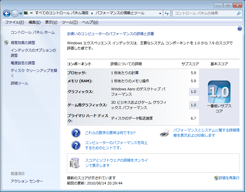 Windows XPの環境が復活したので、Windows 7側の環境構築に戻ることにします。とりあえず今の状態のベンチマークをとってみます。まずは Windowsエクスペリエンスインデックス。続いてCrystalMark 2004R3です。。なぜかグラフィクスのスコアが低いです。そういえば休止モードは選べるのに、スリープが選べなかったなあと思い、コマンドプロンプトを立ち上げて利用可能なスリープ状態を確認してみます。C:\> powercfg /aなんと標準のVGAドライバが使われていて、スタンバイモードやハイブリッドスリープをサポートしていないと表示されました。1920x1200が設定できたので、標準のインストール作業だけで適切なVGAドライバが入っていたのかと思っていたのですが、そうではなく最近はNVIDIA用の標準ドライバというものがデフォールトでインストールされるようです。その状態ではアクセレータ機能なしでWUXGAの表示ができているようです。このノートPC(LATITUDE D830)にはNVIDIA Quadro NVS 140Mが搭載されているはずなので、さっそくドライバをインストールするために NVIDIAのホームページをさがしてみます。NVIDIAグラフィックスがMicrosoft Windows 7をスーパーチャージ Quadro NVS 140Mを探すので…Windows 7 ソリューションデバイスの一覧がありました。NVIDIA Quadro NVS 140Mドライバは?Windows 7 ドライバー製品のタイプ Quadro製品シリーズ Quadro NVS Series (Notebooks)製品ファミリー Quadro NVS 140Mダウンロードタイプ Quadroグラフィックスドライバオペレーティングシステム Windows 7 64-bit言語 Japaneseで検索します。ダウンロード143MBの巨大なファイルです。ダウンロードして、インストールします。インストール後、デバイスマネージャを確認すると…正しいドライバがインストールされたようです。NVIDIAのドライバが更新されたので、ベンチマークを測定しなおします。まずは Windowsエクスペリエンスインデックス。続いてCrystalMark 2004R3です。これでようやくさくさく動作するようになったようです。ちなみにWindows XP時代のベンチマーク結果はこんなでした。SSD搭載後SSD搭載前FPUの結果が悪くなった気もしますが、グラフィックスはいい値でまとまったようです。またシャットダウンのところのスリープも選択できるようになりました。コントロールパネルの「電源オプション」で「バランス」のところの「プランの設定の変更」を開き、「詳細な電源設定の変更」を開くとスリープ関連の設定が表示されています。VGAドライバを更新する前は次のように「ハイブリッドスリープ」等の設定は表示されていませんでした。一安心です。