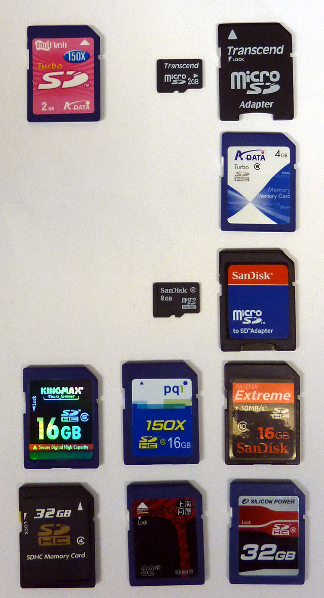 購入したSD/SDHCカードの種類が増えてきたので、手持ちのSD/SDHCカードのベンチマークを測定してみることにしました。楽天市場の買い回りキャンペーンがあると必ずといっていいほどSDカードを購入しているような気がするので、結果的にいろいろな種類のカードを持っています。・東芝 SD-K32G (Class 4)・SanDisk Extreme 16G(Class 10)SDSDX3-016G-J31A・pqi 16G(Class 10) BSDH10-16G・KINGMAX 16G(Class 6) HCK16G6・上海問屋 32G(Class 6)・A-DATA 2G(150X)・A-DATA 4GB (Class 6)・SILICON POWER SP032GBSDH006V10 32GB (Class 6)Team SD 2GBシリコンパワー micro SDHC 4GB Class6 (SP004GBSTH006V10)Transcend 2GB microSDKINGMAX SDHC 16GB Class6(600-HCK16G6)TOSHIBA SDHC Card 32GB Class4(SD-K32G)上海問屋 SDHC 32GB Class6(EVERGREEN DNF-SDH32C6/R)A-DATA Turbo SD 150X 2GBSanDisk microSDHC 8GB Class2シリコンパワー SDHC 32GB Class6 (SP032GBSDH006V10)A-DATA Turbo SDHC 4GB Class6 SDHC4GBPQI SDHC 16GB Class10 150X(BSDH10-16G)SanDisk Extreme 16G Class10 (SDSDX3-016G-J31A)結果をまとめると次の表のようになります。メーカー名前Class型名Seq Read512k Read4K ReadSeq Write512K Write4K WriteTeamSD 2GB--10.710.422.5393.5131.6860.026シリコンパワー micro SDHC 4GB Class6SP004GBSTH006V1015.5415.224.4748.2872.6570.033Transcend microSD 2GB --19.9719.76.4278.5722.6860.027KINGMAX SDHC 16GBClass6600-HCK16G617.7817.445.0279.8711.1930.011TOSHIBA SDHC 32GBClass4SD-K32G21.5421.054.05310.972.2770.027上海問屋 SDHC 32GBClass6DNF-SDH32C6/R20.0619.352.89711.942.3910.023A-DATA Turbo SD 150X 2GB150X-21.3120.875.3712.275.8460.089SanDisk microSDHC 8GBClass2-21.7921.093.63112.941.9980.017シリコンパワー SDHC 32GB Class6 SP032GBSDH006V1021.3420.643.18913.452.1140.019A-DATA Turbo SDHC 4GBClass6SDHC4GB2221.567.3314.332.3770.024PQI SDHC 16GB Class10 150XBSDH10-16G21.5521.266.13818.330.770.006SanDisk Extreme 16G Class10SDSDX3-016G-J31A28.7327.634.31224.641.5550.012またPanasonicのデジカメ DMC-TZ7の電源を入れてからSDカードへのアクセス表示が消えるまでの時間を16GB 2種類、32GB 3種類を使って比べてみました。メーカー名前Class型名カメラの起動時間TOSHIBA SDHC 32GB Class4SD-K32G6.5秒上海問屋 SDHC 32GB Class6DNF-SDH32C6/R4.8秒シリコンパワー SDHC 32GB Class6SP032GBSDH006V106.3秒PQI SDHC 16GB Class10 150XBSDH10-16G5.2秒SanDisk Extreme 16G Class10 SDSDX3-016G-J31A3.7秒基本的には高速なSDカードをつかっていたほうが、カメラをはやく操作できるようにもみえますが、上海問屋製だけなぜかベンチマーク結果の順位と異なりTOSHIBA,シリコンパワー製よりはやくつかえるようになります。最近使用していたのはTOSHIBAのカードだったので、SanDisk Extreme 16Gにすると約3秒起動時間が短縮され、軽快に操作できるようになりました。これからはSanDisk Extreme 16Gをカメラに入れて持ち歩こうと思います。☆とにかく高速なSDHCカード(16GB)SanDisk SDSDX3-016G-J31A SDHCカード 16GB 6,800円~☆安いながら高速だった SDHCカード(16GB)SDHCカード Class10 16GB 永久保証 PQI BSDH10-16G 3,350円~☆カメラと相性がよかったSDHCカード(32GB) [送料\399~] 上海問屋オリジナル SDHCカード 32GB 高速クラス6 相性保証付き6,999円