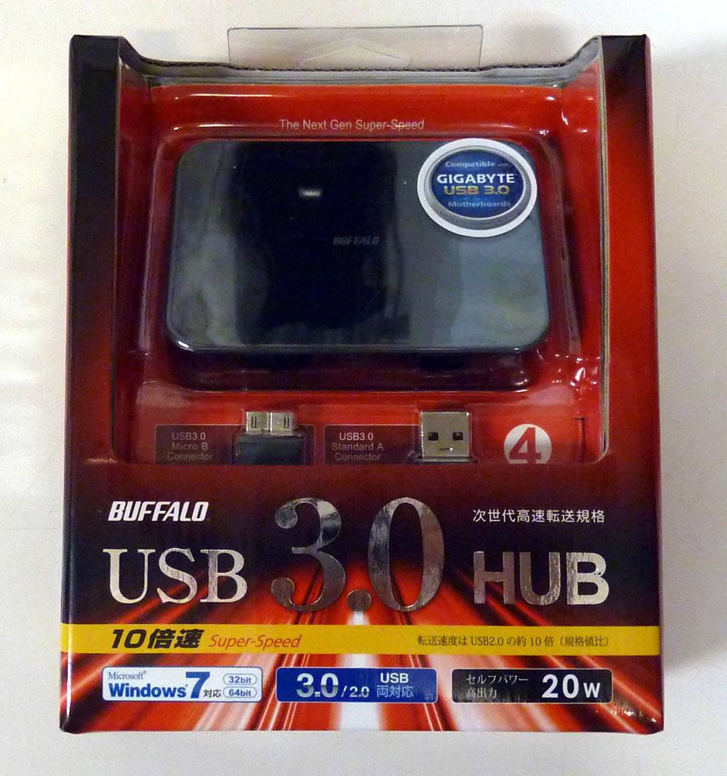 ノートPCのUSB3.0インターフェースボードは供給電力がUSB3.0の規格を満たせないことがわかったこともあり、USB3.0用のHUBが欲しかったのですが、購入してしまいました。実はもう一月以上前に購入して使いはじめていたのですが、一月おくれでブログに書いておきます。購入したのは購入時に唯一販売されているとたバッファローコクヨサプライのBSH4A03U3BK・USB3.0対応USBハブ 4ポートタイプ・高速USB3.0の性能を活かせるスーパースピードモード〔最大5Gbps(規格値)〕に対応。・ACアダプター付きのセルフ&バスパワー両対応というホームページの説明に安心して購入したのですが、仕様のところに次のような気になる記述があります。※本製品に接続する機器の消費電力の大きさにより、正常に動作しない場合があります。※本製品はUSBハブですが全てのUSB機器に接続できるものではありません。※特殊な互換性を必要とする周辺機器などは正常に使用できない場合があります。※USBハブ機能つきのテンキーなどから本機を接続した場合は正常に動作しない場合があります。おきまりの文句なのか、それともこのハブ固有のなにかがあるのかちょっと気になります。パッケージは次のようなものです。表側です。裏側です。 横です。中にはこのようなものが入っています。USBハブ本体と、ACアダプター、USBケーブルと説明書です。ACアダプターは5V 4Aで最大20Wのものになります。さっそくノートPCのUSB3.0インターフェースに接続して、SDカードリーダ(MR-A001BK)をHUB経由で接続してみました。特に問題なく認識できたようです。続いて、USB3.0対応ケースに入ったST350083を接続します。SDカードリーダを接続したままで、これも問題なく認識しました。HUB経由でUSB3.0のデバイスへのアクセス速度が変化するかどうかを確認するため、このUSBドライブに対して CrystalDiskMarkを実行してみます。HUB経由の結果です。HUBなしで直接接続するとこんな結果です。ほとんど結果に差はありません。さていよいよ裸族のインテリジェントビルUSB3.0+eSATAコンボ (CRIB35EU3)を接続してみます。…結果はHUBなしで接続した場合と変わりませんでした。HUB経由で接続しても RAID HDDを認識することはできません。どうやら電源容量以外のなにかが問題となってRAID HDDを認識できないようです。------------------------------------------------------------------------☆今回購入したものバッファロー BSH4A03U3BK 4,200円~
