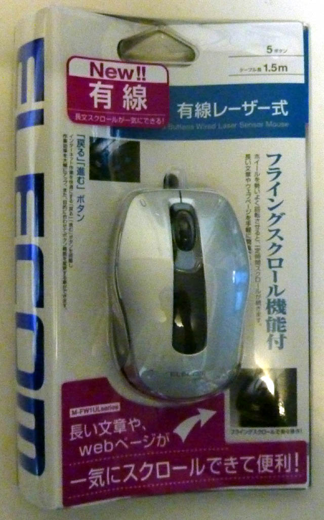 ノートPC(DELL LATITUDE D830)にBluetoothマウスを接続して使用していたのですが、もとから使っていたWindowsXPに加えてWindows 7をインストールして使ったところ、OSを切り替えるたびにBluetoothの設定をしなおさなければならなく不便に感じていました。マイクロソフト Bluetooth Notebook Mouse 5000 2,931円~そこでもとから使用していたBlueToothマウスはVAIO Type Pで使うことにして、新たにUSBマウスを購入することにしました。マイクロソフト Bluetooth Notebook Mouse 5000はBluetoothなので当然無線なのですが、使っているとそのうち電池が消耗して、交換するのが結構面倒に感じていました。そこで今回は有線のUSBマウスを購入することにしました。机には透明なシートがのせてあるため、以前光学式マウスを使っていたときにはマウスパッドなしではほとんど操作できませんでした。そこで、最新のレーザー方式のマウスで安価なものを探すことにしました。いろいろ検索してみたのですが、なかなか実物を見ないと比較は難しいです。今回は、フライングスクロール機能という宣伝文句がなんとなく気になってエレコム ELECOM フライングスクロール機能付きレーザーマウスM-FW1ULSV を購入しました。フライングスクロール機能高精度レーザーボタンへ機能割り当てなかなか高機能なようです。パッケージは次のようになっています。中身を出すとつぎのようになります。レーザー部が見えるよう裏面から見るとこんな感じです。以前使用していたマウスは無線方式で電池を内蔵していたためか、新しいマウスはやたら軽く感じます。カタログをしらべてみると、前のマウスは約 64 g (電池なし)約 88 g (電池あり)これに対して新しく購入したマウスは質量:65.5g23gの違いなのですが、かなり違って感じます。慣れの問題かもしれませんが、新しいマウスには何か重しを追加してもう少し重たくしたいぐらいです。レーザーセンサーは問題なく機能しているようで、マウスパッドなしでも透明シートの上で問題なく操作できます。けれどもマウスのすべりはマウスパッドありのほうがずっとよくなるので、通常はマウスパッドを使用しています。また特徴の一つの「フライングスクロール」機能もためしてみました。ホイールを勢いよく回転すると、しばらくスクロールが継続動作します。途中で停止させたいときはスクロール中にホイールを少し動作させればよいようです。以前LogicoolのMXを使用していたときは、本当にホイール自体が回転し続けたので、それにくらべると少し操作しにくいのですが、Logicoolのマウスは約1万円だったのに比べて、このマウスは2500円弱。まあしょうがないでしょう。エレコム ELECOM フライングスクロール機能付きレーザーマウス シルバー M-FW1ULSV 2,240円~Windows XPとWindows 7を起動しなおした場合は、今度は即座にマウスを認識して、特に設定を変更しなくてもすぐにつかえます。やはりこうでないと困ります。さてこの週末に、時間があったのでヤマダ電機で色々商品を眺めていたのですが、なんとレーザーマウスが500円で販売していました。予備のマウスも欲しかったのでつい購入してしまいました。パッケージは次のように Windows 7対応のロゴも入った商品です。カタログでは本体重量が95gと書かれており、今使っているUSBマウスよりは重たくなりました。気分的にはこのくらいのほうが操作しやすく感じます。やはりマウス・キーボードは微妙な感覚の違いが気になってくるので、できれば実際にさわって購入したほうがよいようです。ちなみにこのマウスを楽天で検索すると安値は780円~のようです。これも透明シートの上で問題なく操作できているようなので、機能的にはこれで十分です。レーザーマウスもずいぶん安く入手できるようになったものです。