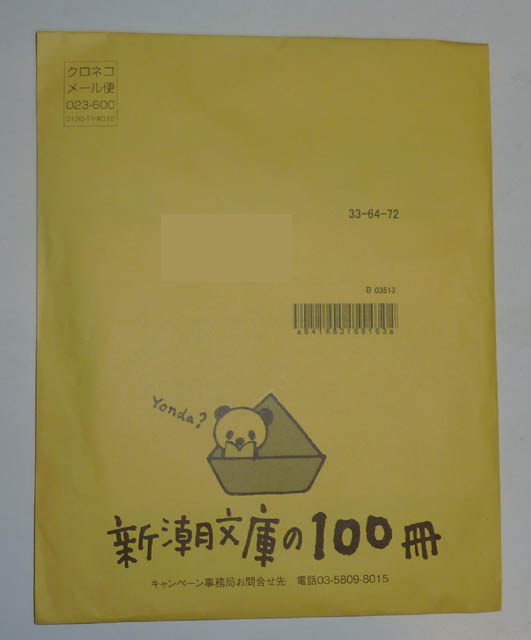新潮社の今年の夏のキャンペーンは、「2010 新潮文庫の100冊」の中からどれでも2冊購入すると、Yonda?のバンダナ「ヨンダナ」が必ずもらえるというものでした。締切が平成22年9月25日(当日消印有効)ということで、締切ぎりぎりに応募していたのですが、忘れた頃に届きました。黄色いクロネコメール便で届きました。カラフルな表紙がついた袋の中に入っています。中から取り出して広げてみました。表紙の紙の右上の柄のようです。袋には色落ちなどの注意書きがぎっしりと書かれています。バンダナというかハンカチのような気もしますが、色落ちするということなので、使わずに取っておこうと思います。出版社では毎年夏休み期間にこのようなキャンペーンを行うようです。こういったキャンペーン期間中にまとめ買いをすると、なんとなく得した気分になれます。この夏に購入した新潮文庫は次の2冊です。重松清 青い鳥伊坂幸太郎 砂漠青い鳥は先に映画を見ていたのですが、村内役の阿部寛と原作の村内先生はずいぶんイメージが違って感じました。やっぱり原作のほうがいろいろなことを考えさせてくれていいです。「本当にたいせつなことは何かを教えてくれる」村内先生。こんな先生に出会えた人は本当にしあわせでしょう。青い鳥価格:620円(税込、送料別)砂漠価格:780円(税込、送料別)