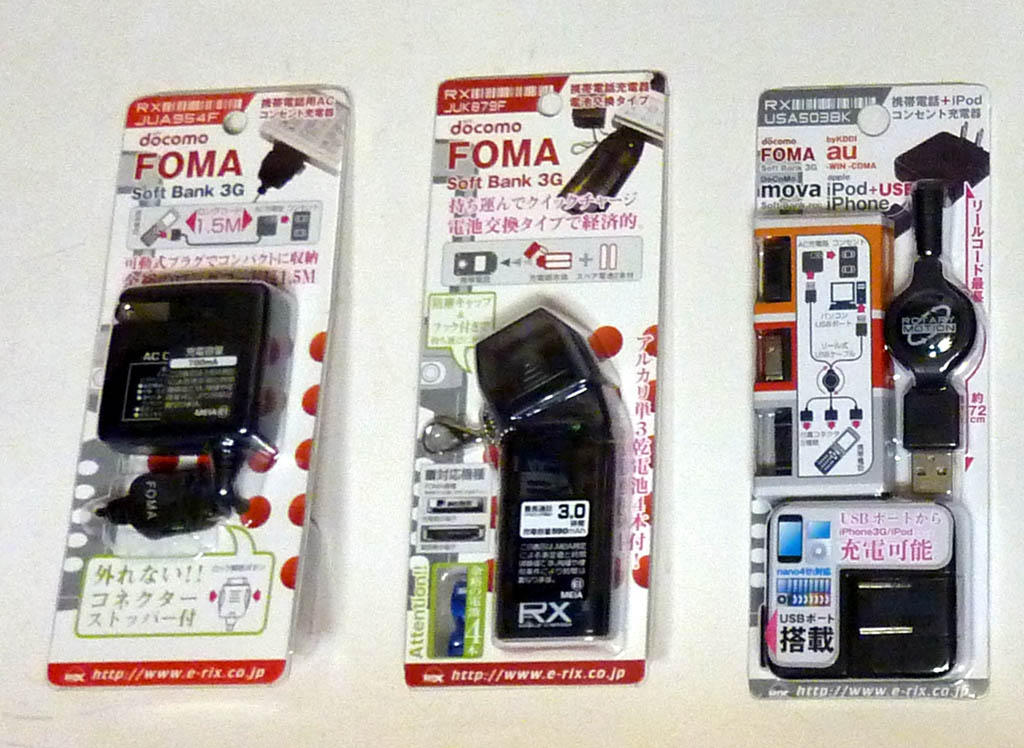 FOMA用充電器をいろいろ購入してみました。3種類をまとめて購入してしまいました。次のような3種類になります。(1)シンプル(2)マルチ対応(3)乾電池タイプ(1)シンプル一つ目はシンプルなFOMA専用のAC充電器です。コンセント部は折りたためるようになっています。これは普段使い用になります。(2)マルチ対応二つ目は色々な機種に対応したAC充電器です。FOMA/au/mova そして iPod/iPhone, USB充電に対応しています。AC充電器部には出力端子としてはUSBコネクタだけがでています。その先にケーブルを巻き取る方式のUSBケーブル、そして3種類の携帯電話用アダプタがつながるようになっています。USBコネクタにiPod/iPhoneの充電ケーブルを接続すればiPod/iPhoneの充電にも使えるということのようです。ケーブルをそのままパソコンにつないで、パソコンから充電するという使い方もできます。つなぐと次のようになります。アダプタは3種類のものがひもでつながっていて、なくなりにくいようになっています。けれどもちょっと邪魔です。これは家族の誰でも使えるので、みんながつかいやすい場所においておこうと思います。(3)乾電池タイプさて最後は乾電池を使う充電器です。これはFOMA専用です。単3乾電池がケースの中に入るようになっています。ケースから直接出ているコネクタを携帯電話に差し込むことになります。アルカリ単3乾電池が4本ついてきました。携帯電話とこの充電器を持ち歩いていれば、携帯電話のバッテリーがきれそうになった「ピンチ」に役立ちます。単3乾電池は駅・コンビニなどたいていどんな場所でも売っています。自分の場合は充電池「エネループ」を持ち歩いているので、これを入れて使うことになります。今回は3,500円以上購入すると送料が無料となるWebbyで他の商品と一緒に3,500円以上なるようにして購入しました。Webbyでは電球、DVDメディア等が結構安く販売しているので、ちょくちょく利用しています。それぞれの価格はつぎのとおりです。(1) リックス FOMAに対応AC充電器 ブラック RX-JUA954F 600円(2) リックス FOMA/SoftBank/au/mova用充電器 RX-USA503BK 1010円(3) リックス FOMAに対応AC充電器 ブラック RX-JUA954F 690円ちなみに(3)の乾電池を使う充電器は携帯電話がバッテリー切れでオフになった状態からエネループ2本をいれた状態でつないでみたところ、4時間程度経過後に携帯電話は満充電状態になって充電終了していました。単3電池を4本程度一緒に持ち歩いていれば、携帯電話がバッテリー切れで困ることはなずなさそうです。