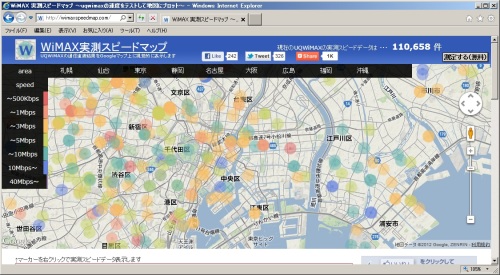 JRで新宿⇔亀有の間で WiMaxの速度測定をしました。基本的には電車に乗っている途中でのアクセス速度ですが、亀有では店に入ったときにも測定してみました。測定したポイントは・亀有駅前の日高屋・綾瀬・北千住・南千住・三河島・西日暮里・田端・駒込・巣鴨・大塚・池袋・目白・高田馬場・新大久保の各駅です。ちなみに、地下鉄の区間はまったく通信できなくなりました。北千住から綾瀬の途中までは電波がまったく受信できません。速度測定には「WiMAX実測スピードマップ」のサイトを使用したのですが、亀有の日高屋で測定したときに、なんと「400Mbps」以上というありえない値が表示されたこともあり、Windowsタスクマネジャーのグラフを一緒に表示しています。実験してみていると、基本的にWindowsタスクマネージャーのグラフは嘘をつきません。1メモリが約3Mbpsと思うと、だいたい正しい値がとれているように見えます。またWindowsタスクマネージャーのグラフのいいところは、転送速度の時間変化がわかることです。きれいな台形になっているときは、通信が安定しており、途中に凸凹があるときは、通信途中で電波の受信具合が悪くなったと考えられます。---------------------------------------------------------・亀有駅前の日高屋・綾瀬・北千住・南千住・三河島・西日暮里・田端・駒込・巣鴨・大塚・池袋・目白・高田馬場・新大久保亀有の日高屋、綾瀬、北千住、田端、池袋、高田馬場では 10Mbpsを超えてきてます。特に田端駅ではタスクマネージャで4メモリ目まで安定して達しています。高架下などに入ると、接続がきれたりするのですが、外出先で、外の椅子にすわっていれば、結構安定して接続できます。なかなか優秀でした。------------------------------------------------------------------得な2台ルータセットがなくなってしまっている…もれなく3,000ポイントプレゼント!さらにポイント10倍!レビューでQUOカード500円プレゼント!送...価格:2,800円(税込、送料込)もれなく3,000ポイントプレゼント!さらにポイント10倍!レビューでQUOカード500円プレゼント!送...価格:2,800円(税込、送料込)もれなく3,000ポイントプレゼント!さらにポイント10倍!レビューでQUOカード500円!送料無料UQ W...価格:6,800円(税込、送料込)