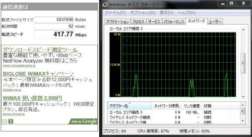 WiMAXを今度はデスクトップPCに接続して、同じように速度測定をしてみました。なぜかデスクトップPC(Windows 7 Ultimate 64bit)ではホームページからダウンロードしたドライバがそのままインストールできたようです。さっそく速度をWiMAX実測スピードマップのサイトで測定してみます。部屋の場所は結構ちがうのですが、やっぱり4Mbps程度になります。そしていろいろダウンロードやベンチマーク測定をしてみたところ、どうやらこのWiMAX実測スピードマップページでは比較的小さいサイズのデータで測定しているようで、測定誤差が大きいようです。Windows タスクマネージャーのネットワークタブで、直近の転送速度が%で見れるのですが、このグラフから計算される値と結構かけはなれた値がたびたび表示されます。自分が試した中で測定結果が安定していると思ったのは「Radish Network Speed Testing 」のサイトです。測定サーバーが東京・大阪で選べ、測定メニューの中に測定制度という項目があります。ここで「高」を選ぶと、比較的安定したデータがとれます。次に、翌朝測定していて気がついたのですが、どうやら昨晩よりも結果がよくなっているようです。何度測定しても4Mbpsより大きな値が測定できるようになりました。電波状況は深夜のほうがよいような気もしますが、近くで使用しているユーザーがいるせいでしょうか?とりあえず大量のデータをダウンロードしはじめてみました。--------------------------------------------------------------WiMAXの価格を調べてみると、どうやら価格.com経由が安くなるようです。2年契約なのに初年度の月額で比較しているというところは、ちょっと嘘くささがありますが、月額費用 3,880円キャッシュバック 16,000円ということで実質2,223円/月で1年間使えます。でも実際は定額2年プランなので3,052円/月というのが正しい値段のようです。1年契約で一番安いのはSo-net モバイル WiMAX Flat 年間パスポート 【モバイルWi-Fiルーター】Aterm WM3600R(AT)月額3,800円キャッシュバック10,000円ということで、 2,640円/月で使用できます。これなら一年後に解約できます。ただルーターを自宅・持ち運びの2台入手しようとすると、やっぱり UQ WiMAXホームページの契約が一番得なようです。もれなく5,000ポイントプレゼント!さらにポイント10倍!レビューでQUOカード500円プレゼント!送...価格:5,800円(税込、送料込)ルーターだけショップで購入するとURoad-Home : 16,000円AtermWM3600R : 16,010円5,800円支払うことになりますがでポイントとQuoカードでほぼ同じ金額が返ってきます。つまり実質ルーター2台分の代金はただで、1年間3,880円/月の契約になります。価格.com の契約でもらえる10,000円のキャッシュバックでは2台目のルーターを買う金額には足りないので、その分得な計算になります。うーむ、だいぶ買う気になってきました。
