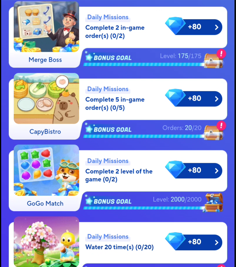 AliExpressアプリでゲームを遊んでポイントをためて、割引券に交換できるという「Play & Earn」ですが、内容がかわっていましたポイントを獲得する条件が徐々にかわっているようなのですが、11/28頃に新しいゲーム CapyBistroがはじまって、5つの方法でポイントがもらえるようになった一方ポイントをもらう条件が厳しくなり、またもらえるポイント数が減っています現在は次の5つの方法でポイントがもらえます(1) Daily Lucky wheel 1日1回できるくじ引きで 1~3000ポイントもらえます。100point もらえる日が多い気がしますが、 1 pointの場合はがっかりします(2) Merge Boss(3) CapyBistro(4) GoGo Match(5) Prize Land (2)~(5)のゲームでは達成条件に応じて 80~120ポイントもらえます(80/100/120)最初のころは 条件に応じて100~200ポイント(100/120/150/200) もらえたので、 最大で合計=100+120+150+200=570ポイント/Gameだったのが、現在は合計=80+100+120 = 300ポイント/Gameとなっていてもらえるポイントが半減しています。またそれぞれのゲームでもらえる条件・ポイントは次のようになっています(12/1現在)(2) MergeBoss2回クリア = 80 point7回クリア = 100 point15回クリア= 120 point(以前は 1/5/10/15)(3) CapyBistro5回クリア = 80 point30回クリア = 100 point80回クリア = 120 point(新規ゲーム)(4) GoGo Match2 Gameクリア = 80 point6 Gameクリア = 100 point12 Gameクリア = 120 point(以前は1/3/6/10)(5) Prize Land20回 = 80 point100回 = 100 point220回 = 120 point(以前は10/50/100/220)ポイントがもらえる条件が厳しくなったうえに、ゲーム全部で目標達成してもらえる合計ポイント数も 570x3 -> 300x4 ということで以前は1,710 point だったのが 現在は 1,200 point と減っています。想定外にポイント獲得者が多かったのか、それともはじめだけポイントを高めにつける集客だったのか、とにかくだんだんメリットが少なくなっているようです。また交換できる割引券の多くが売り切れになっているようです早く交換しないとダメみたいですーーーgoogleで検索可能ーーーー関連記事ーーーー2024/12/4 CapyBistro(カピビストロ)の Level 4がクリアできました2024/12/2 AliExpressの Play &Earnの内容がかわってもらえるポイントが減りました2024/11/30 AliExpressに新しいゲーム Capy Bistro(カピビストロ)が追加されたようです 2024/11/11 aliexpressのキャンペーン:Play &Earnーーー 広告 ーーーーーー2025/3/24 獲得できるポイント数が徐々に変わっています 100+120+150+200 ⇒ 80+100+120 ⇒ 最近は 100→120→150 とミッションの難易度が上がると多くなっていました。 今週(?)、毎回 獲得できるポイントが100 になってしまいました 100→100→100 獲得できるポイント数で何回目のミッションなのかを判別していたのですが、今後は獲得条件を確認しないとダメみたいです