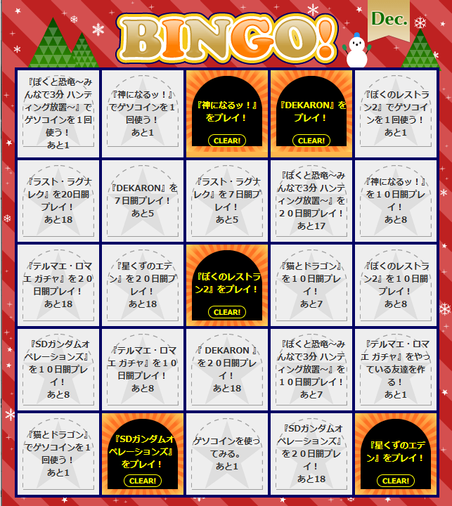 ーーー 広告 ---ーーーーーーーーーーゲソてん 2024年 12月ビンゴでスター・エッグがもらえるゲーム一覧です☆ゲーム一覧1. ラスト・ラグナレク(7/20)2. DEKARON(1/7/20)3. ぼくと恐竜(10/20/coin)4. 神になる(1/10/coin)5. テルマエ・ロマエガチャ(10/20/friend)6. 星くずのエデン(1/20)7. 猫とドラゴン(10/coin)8. ぼくのレストラン2(1/10/coin)9. SDガンダムオペレーションズ(1/10/20)+10. (ゲームでcoinを使う)11. (ゲームをやっている友達をつくる)ーーーBINGO!ーーー☆報酬BINGOx1 : スターx30BINGOx2 : スターx30 + 50エッグBINGOx3 : スターx30BINGOx4 : スターx30+100エッグBINGOx5 : スターx50+300エッグBINGOx12: 1,000エッグ+ 山分け1,000エッグ:100ゲソコインに交換可能3,000エッグ:330ゲソコインに交換可能ーーー☆BINGOの並びGame Playだけだと 3 BINGOGame Play +どれかでCoin使用で5 BINGcoincoinplayplaycoinplayplayplayplayplayplayplayplayplayplayplayplayplayplayfriendcoinplaycoinplayplay先月までは、ゲームを遊ぶだけで 5 BINGO 達成できたのですが、今月からは ゲソコインを使わないと(課金しないと) 5 BINGO 達成できなくなったようです☆ゲソコイン使用ぼくと恐竜:有償ダイヤ=120コイン~神になる:元宝:VIPパープルダイヤ=145ゲソコイン~ぼくのレストラン:スタミナドリンクミニ=20ゲソコイン~猫とドラゴン:スライムパウダー3個セット=90ソコイン~うーむ…ーーー2024/12/3 6:00 公開googleで検索できない2024/12/25 やっぱりgoogleで検索できないーーーー関連記事ーーーー2025/1/1 PontaゲームスPro マンスリーミッション(2025年1月)2025/1/1 ゲソてん 2025年1月ビンゴーーー2024/12/3 PontaゲームスPro マンスリーミッション(2024年12月)2024/12/3 ゲソてん 2024年12月ビンゴ2024/11/29 AliExpress MergeBossのMillionaire Challengeのクリア報酬がもらえました2024/11/10 MergeBoss(マージボス) Millionaire Challenge(2024/11)2024/11/5 MergeBoss(マージボス) Daily Missions (2024/11)