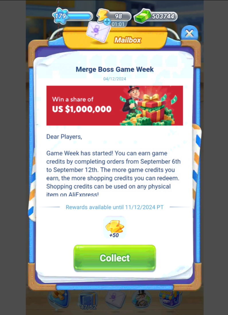12/1になって Daily Missionの報酬がもらえなくなっていた AliExpressアプリのMerge Boss(マージボス)ですが、今日(12/4) 17:00の更新後に確認したら、新しいメッセージが表示されました。9月に開催されていた Game Weekの報酬がもらえたみたいですそして、次の画面のように、新しく Magic Season の Millionaire challengeが開始したようです。どうやら前の Millionaire challengeから次の Millionaire challengeへの切替期間 ここ数日 Daily Missionsの報酬がもらえなくなっていたようです。Millionaire challengeの報酬は…Millionaire challenge の開催期間は 12/4~12/28 の間で、達成目標は前回と同じように、Level 1~ Level 55 まであって、前回と同じような報酬がもらえるようです。12/28 には次のような MergeBossのゲーム内で使用できるアイテムももらえるようですちなみに前回もらった割引クーポンは今回の BLACK FRIDAYの買い物で使いました。さっそく Merge Bossを Playしてみたところ、ここ数日もらえなかった Daily Missionsの報酬がもらえるようになっていました。全レベルクリアしても$1程度の割引クーポンがもらえるだけで、たいしたものではないのですが、またDaily Missionsをこなす日々が再開します。ーーー2024/12/5 1:00googleで検索可能ーーーー関連記事ーーーー2024/12/3 AliExpressでMerge Bossの新しいMillionaire challengeが開始(2024/12))2024/12/3 PontaゲームスPro マンスリーミッション(2024年12月)2024/12/3 ゲソてん 2024年12月ビンゴ2024/12/2 MergeBoss(マージボス)でDaily Missions の報酬がもらえなくなってます2024/11/5 MergeBoss(マージボス) Daily Missions (2024/11)ーーー 広告 ーーー