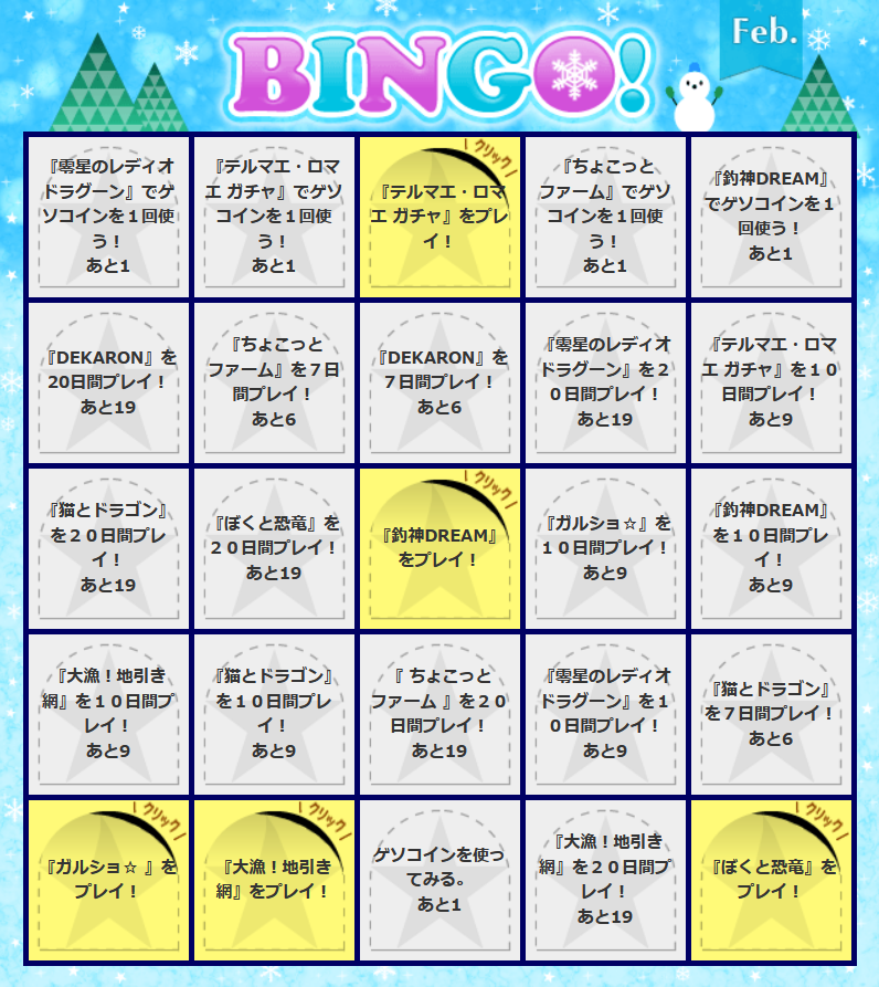 ーーー 広告 ---ーーーーーーーーーーゲソてん 2025年 2月ビンゴでスター・エッグがもらえるゲーム一覧です☆ゲーム一覧1. 零星のレディオドラグーン 2. テルマエ・ロマエ ガチャ3. ちょこっとファーム4. 釣神DREAM 5. DEKARON6. 猫とドラゴン7. ぼくと恐竜〜みんなで3分8. ガルショ☆ 9. 大漁!地引き網 ☆ゲソコインを使用1. 零星のレディオドラグーン 2. テルマエ・ロマエ ガチャ3. ちょこっとファームーおじゃま復活ドリンク:50ゲソコイン4. 釣神DREAM ーーー☆BINGO!ーーー☆報酬BINGOx1 : スターx30BINGOx2 : スターx30 + 50エッグBINGOx3 : スターx30BINGOx4 : スターx30+100エッグBINGOx5 : スターx50+300エッグBINGOx12: 1,000エッグ+ 山分け1,000エッグ:100ゲソコインに交換可能3,000エッグ:330ゲソコインに交換可能ーーー☆BINGOの並びGame Playだけだと 3 BINGOGame Play +どれかでCoin使用で5 BING今月も友達をつくらなくていいみたいcoincoinplaycoincoinplayplayplayplayplayplayplayplayplayplayplayplayplayplayplayplayplaycoinplayplayーーー2025/2/1 13:00 公開2025/2/1 16:20 googleで検索可能 (検索するPCによって結果が異なる)ーーーー関連記事ーーーー2025/2/1 PontaゲームスPro マンスリーミッション(2025年2月)2025/2/1 ゲソてん 2025年2月ビンゴーーー2025/1/1 PontaゲームスPro マンスリーミッション(2025年1月)2025/1/1 ゲソてん 2025年1月ビンゴーーー2024/12/3 PontaゲームスPro マンスリーミッション(2024年12月)2024/12/3 ゲソてん 2024年12月ビンゴ2024/11/29 AliExpress MergeBossのMillionaire Challengeのクリア報酬がもらえました2024/11/10 MergeBoss(マージボス) Millionaire Challenge(2024/11)2024/11/5 MergeBoss(マージボス) Daily Missions (2024/11)
