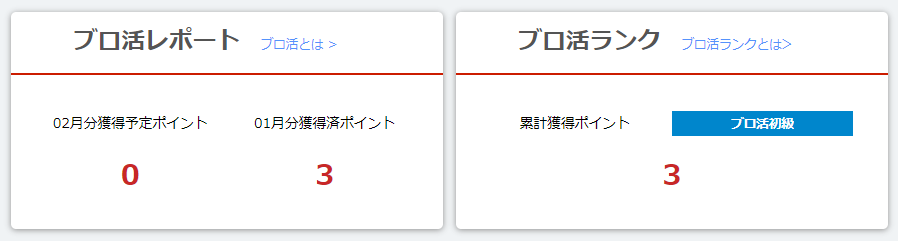 ブロ活レポートで 獲得予定ポイントではなく、獲得済ポイントの欄に0以外の数字がはじめてはいったようなので、まとめておきます「01月分獲得済ポイント」に3ポイントと表示されているので、ブロ活ポイントを初めてもらえたみたいです。進捗をまとめておきます。管理画面トップに表示されていた獲得予定ポイントは次のように変化しました。1/ 1 01/10 0→11/19 1→21/26 2→31/31 3 で終了1/101/191/262/1 0:002/1 6:00同じ期間のこのブログのトータルのアクセス数は次のように変化しました1/1 0:01 = 1,823,279アクセス2/1 0:00 = 1,840,366アクセス1月はトータルアクセス数が約 17,000 アクセスあったようです。今月はブログのバックアップなどのために、過去記事を頻繁にアクセスしたときもあり、時々アクセス数が急増した日もありました。(バックアップ関連作業をするとアクセス数が大きく変化していたようなので、おそらくですが…2025/2/1現在 このブログの日記の数は 752件なので、全部読むとアクセス数が 752増加してしまうみたいです)そのため、ブロ活広告を表示した回数は上のアクセス数の半分以下だったと予想しています。ブロ活広告の表示された割合はわからないので、単純計算すると17,000アクセス→3ポイントということで 全てのアクセス時に広告を見ていたなら 5000アクセスで1ポイントの計算です実際には 1000~2000回程度広告を見ると1ポイントもらえたのではないかと思います。1か月かけて 楽天Web検索でもらえる1日分(4ポイント)にも達しないということで、非常に効率が悪いような気もしますミッションクリアで毎日ポイントGETのほうが効率がいいですね…(自分以外のユーザが投稿した記事に「いいね!」!+動画広告視聴を毎日15回すれば月に30ポイント)来月以降もポイントがもらえるようであれば、ブログに書こうと思います。ーーー2025/2/2 1:00 公開予定に設定しておいたら、 メンテナンスのせいで6:00過ぎになっても公開されないので、更新してみたら公開されました…ーーー2025/2/2 6:29 公開(?)2025/2/2 22:15 googleで検索可能(PC②), PC①は検索できないーーー2025/2/8 4:00 02月分獲得予定ポイント = 0→1ーーー 関連記事 ーーー2025/2/2 2025/1のブロ活結果2025/1/18 楽天ウェブ検索でもらえるポイント(山分けに参加できないIDにならないよう注意)2025/1/12 楽天ブログのブロ活って? ポイントがもらえるのはどういう人?(自分も初ポイント?)2024/12/6 楽天PointClubの貯めトクモード キャンペーン:利用するのは難しそうーーー 広告 ーーー