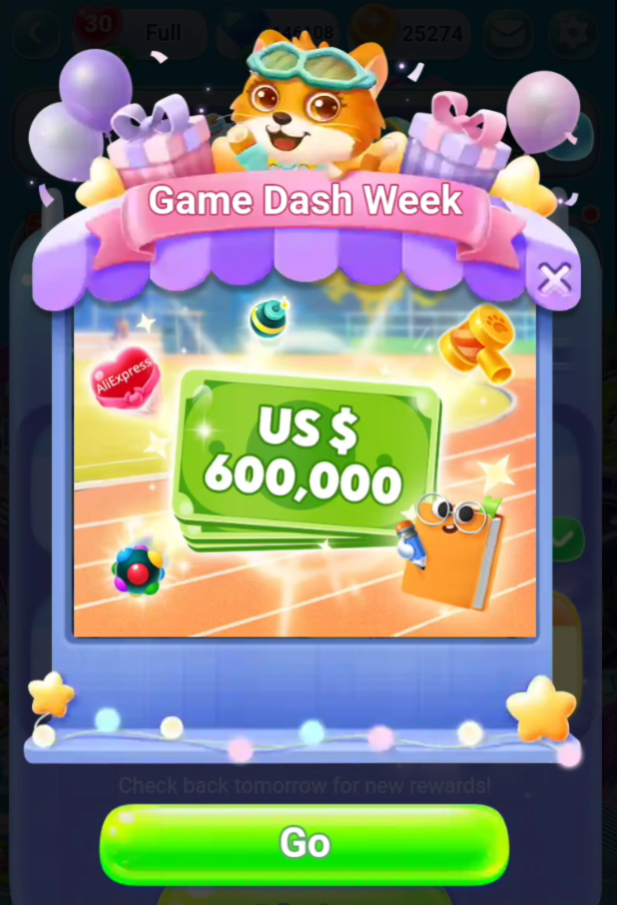 AliExpressアプリで遊べる GoGo Match(ゴーゴーマッチ)2025/2/10 以来 ひさしぶりに、新しいレベルが増えていました。Game Dash Weekの間、新しいレベルの追加がなかったのですが 今日(2/21) 新しいレベルが増えていました。ちょっと前からゲームシステムに変化があって、 ゲームクリア時に XPの値が表示されたり、アイテムのクリア数に応じて報酬がもらえるようになっています。今回追加されたのは Level 2301~2310ですLevel 2301Level 2302Level 2303Level 2304Level 2305Level 2306Level 2307Level 2308Level 2309Level 2310Level 2310をクリアすると…宝箱が…Unlock されて、 今回の追加レベルはおしまいです。New levels coming soon の表示に代わっています最近、クリアするとこんな風に XP の値が表示されるようになりました。Weekly Leader board に XPの獲得数に応じた順位が表示されていて、上位(3位まで?)だと何かもらえそうです。日本語のゲーム画面でHelpを表示すると、こんなことが書いてあります。また今日のゲーム途中にこんな画面が表示されました。「plane」を 100回使ったので、宝石 20個と、飛行機アイテムを3個もらえたみたいです。すこしずつゲームシステムが更新されていくようですーーー2025/2/21 23:50 公開2025/2/21 4:30 googleで検索可能ーーーー関連記事ーーーー2025/2/25 GoGo Match(ゴーゴーマッチ)の最大レベルが Lv.2320になりました2025/2/21 GoGo Match(ゴーゴーマッチ)にひさしぶりに新しいレベルが追加。Lv.2301~Lv.2310が増えました2025/2/11 GoGo Match(ゴーゴーマッチ)にLv.2291~Lv.2300が追加されました2025/2/8 GoGo Match(ゴーゴーマッチ)にLv.2271~Lv.2280, 2281~2290が追加されました2025/2/1 GoGo Match(ゴーゴーマッチ)にLv.2261~Lv.2270が追加されました2025/1/29 GoGo Match(ゴーゴーマッチ)にLv.2251~Lv.2260が追加されました2025/1/26 GoGo Match(ゴーゴーマッチ)にLv.2241~Lv.2250が追加されました2025/1/22 GoGo Match(ゴーゴーマッチ)にLv.2231~Lv.2240が追加されました2025/1/18 GoGo Match(ゴーゴーマッチ)にLv.2221~Lv.2230が追加されました2025/1/15 GoGo Match(ゴーゴーマッチ)にLv.2211~Lv.2220が追加されました2025/1/11 GoGo Match(ゴーゴーマッチ)にLv.2201~Lv.2210が追加されました(新邪魔アイテム登場)2025/1/8 GoGo Match(ゴーゴーマッチ)がLv.2200 まで追加されました2025/1/6 GoGo Match(ゴーゴーマッチ)にLv.2181~Lv.2190が追加されました2025/1/4 GoGo Match(ゴーゴーマッチ)にLv.2171~Lv.2180が追加されました2024/12/28 GoGo Match(ゴーゴーマッチ)にLv.2161~Lv.2170が追加されてました2024/12/25 GoGo Match(ゴーゴーマッチ)にLv.2151~Lv.2160が追加されました2024/12/20 GoGo Match(ゴーゴーマッチ)にLv.2141~Lv.2150が追加されました2024/12/17 GoGo Match(ゴーゴーマッチ)にLv.2131~Lv.2140が追加されました2024/12/14 GoGo Match(ゴーゴーマッチ)にLv.2121~Lv.2130まで追加されました2024/12/12 GoGo Match(ゴーゴーマッチ)Lv.2111~Lv.2120まで追加されました2024/12/11 GoGo Match(ゴーゴーマッチ)の遊び方2024/12/10 GoGo Match(ゴーゴーマッチ)がまた更新。Lv.2110までになりました2024/12/07 GoGo Match(ゴーゴーマッチ)のContinue?2024/12/07 GoGo Match(ゴーゴーマッチ)がさらに更新。ついにLv.2100到達です2024/12/06 GoGo Match(ゴーゴーマッチ)がさらにLv.2090まで増えました2024/12/03 GoGo Match(ゴーゴーマッチ)がLv.2080まで増えました2024/11/28 GoGo Match(ゴーゴーマッチ)の最大レベルが Lv.2070になってます2024/11/25 GoGo Match(ゴーゴーマッチ)の最大レベルが Lv.2060になりました2024/11/23 GoGo Match(ゴーゴーマッチ)の最大レベルが Lv.2050になりました2024/11/21 GoGo Match(ゴーゴーマッチ)の最大レベルが Lv.2040になりました2024/11/19 GoGo Match(ゴーゴーマッチ)の最大レベルが Lv.2030になってました2024/11/16 GoGo Match(ゴーゴーマッチ)のLevel 1~Level 52024/11/15 GoGo Match(ゴーゴーマッチ)の最大レベルが Lv.2020になってました 2024/11/14 GoGo Match(ゴーゴーマッチ)の最大レベルが Lv.2010になってました2024/11/12 GoGo Match(ゴーゴーマッチ)の最大レベルが Lv.2000になってました 2024/11/09 GoGo Match(ゴーゴーマッチ)の最大レベルが Lv.1990になってましたーーー 広告 ーーー