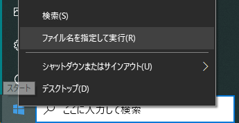 Windowsマークで右クリックをして「ファイル名を指定して実行」を選択します