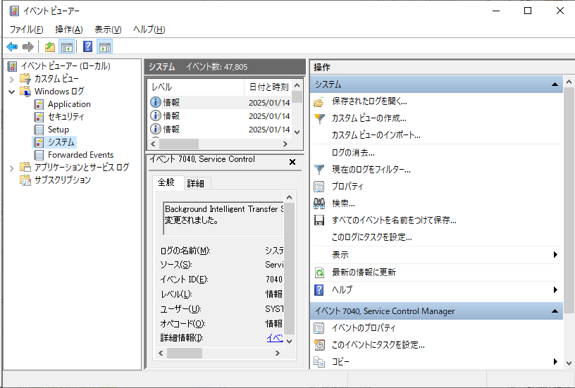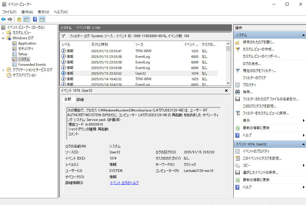 イベントビューアーの画面が開くので「Windowsログ > システム」を選択します