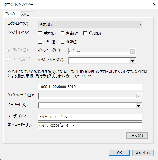 再起動関連のイベントが抽出できるように、イベントIDとして