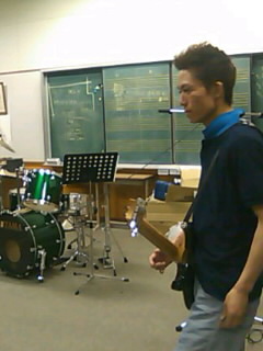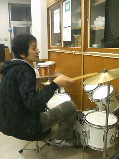 皆さん、これは私がでかくなった訳ではありませんよ?ドラムセットが小さいんです。このドラムセットは”ホザネーズ”のE・Gの藤原さんが持ってきた、セットで、何年か前に子供に買ってあげたやつをもう使わないだろうと言う事で、ここにあるのです。で、実はこのセット結構いい音がします。特にタム類はパーカッションに使えるくらいなのです。ま、持って来た当時、はチューニングなど殆ど手を付けた事が無いと言い、その時俺がちょっといじってみたら、ナナなんと、結構言い音するじゃないですか?と言って、叩いてみせると皆にゲラゲラ笑われました。が、今日久々、ホジネのBの笹ッチの息子さんのバンドのリハ中何を思ったか、俺が徐に叩くとこれが結構気持ち良くなって来て、調子ぶっこき!あのレッドツェッペリンのドラマーのボンゾさんが、ある取材を受けた時、息子さん(ジェイソン)にプレゼントしたとか言う子供用のドラムセットを起用に叩いてみせたと言う事が頭を過ぎり、俺も叩いて味噌!と言う訳で、叩いたところ、結構ハマリまくりで、30分の間、息子さんバンドを邪魔してしまって、ごめんなさい!だが、ピッチがハイトーンなので、息子バンドのドラムと対を張るくらい音が抜けて、良かったのです。終始、笑いが起こり、盛り上がったようでしたが?実際はどうでしょうか?結構迷惑だったりしてね?2枚目は笹ッチが一緒に写ってしまいましたよ~?