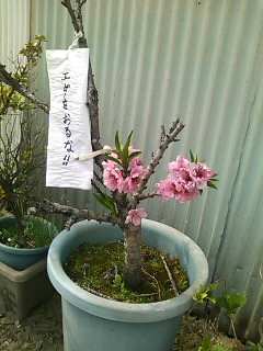 これは桃の木です。この桃の木購入して最初の年は実が成りませんでした。そして次の年、待望の実が成りました。ですが僅か一個でして、その一個の食べごろも解らず、直ぐにつまんでしまって全然美味しくなくて、それで知り合いの桃を栽培してる人に聞いたりしましたが?で、ここ3年の間は桃が成っても食べていません。それは、何故か?お袋と二人で、桃が赤みをおび、そろそろ食べごろと言う時、誰が?ぎ取ったのか?桃が無かったのです。それが3年くらい前から、その状態です。そして今度は、去年の秋から今年にかけて、枝が折られており、見るも無残です。殆どの枝が折られたり、折った枝を持ち帰ったのか?その枝すらありません。そして僅かながら、残った枝に花が咲きました。その後今では、実が成り始めています。お袋は何処かのガキがやったんだよ?と言って折られた枝に”エダを折るな!”と怒りをあらわにして書いた紙を貼り付けて目を光らせていますが?その折った現場を見た者はおらず、俺はもしかして「カラス」かもしれないと思っています。今年は屋根の上とかに置こうかと思っています。そうすれば桃がもし無くなったら、鳥の仕業だと思えるからです。だがしかし、この桃の木は残った僅かな枝に綺麗な花を咲かせ、、その後にもちゃんと実を付けてくれて、本当にけな気ですよね?けな気な中にもたくましささえ感じます。大げさですがその僅かに残った生命の力にいつしか自分をオーバーラップさせて見たりと、そのけな気さを必死で守ろうとする親子がここに居ます。今年は大きく桃の実が成るでしょうか?こうご期待です。