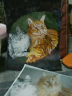 この絵は依頼された物です。飼い主さんが左側の猫ちゃんを亡くされて、今だ尾を引いているとの事で、私の絵本小説”靴物語”の表紙にもなっている”たつお”の絵を見て、是非描いて欲しいと言われ、描き初めてなんと完成まで3ヶ月もかかってしまい、依頼主の方はヤキモキされと思います。何故そんなに時間がかかったのか?それは一つに集中力の問題が上げられます。まず最初、下書き初めましたが?納得せず、何枚も書き直す事になり、そして3日かかって何とか納得のいく物が完成しました。が?この先が中々進みません、それは最初の一筆が出ないのです。描く前の集中力のボルテージが上がらないのです。それには3つの原因があります。一つはレコーディングが始まり、それに対する集中力とは又別の集中力が必要なんです。後はliveなどが入ったり?もう一つは絵を描くのを遠ざかっていたせいで、起きる恐怖でした。最初の一筆が出ないのはそのせいでした。そのせいで何処から描いていいのか解らないのです。経験上私の絵は勢いが必要なのです。何かきっかけがあれば描けると思いますが?とういのは逃げでしょうか?つまり、もう一つの理由として、依頼主の期待に答えられるだろうか?と言う不安感がありました。この3つが頭から離れませんで、自分の気を落ち着かせる為の時間がかかりました。こんなのは初めてで、いい経験をさせてもらいました。そして最後に目を描き込むとき、達成感といいますか?目を描き込む前にはもう頂上が見えているんです、そして、目を入れた瞬間、頂上に立って周りの景色を見渡す心境です。やったーですよ!そして依頼主さんへ絵が届いてすぐにメールが来ました。その依頼主さんは絵を見て泣いてしまったと言いいました。これで私の仕事は終了しましたが、やはり、人に心を伝えると言う意味では、音楽とは変わりありませんが、手段が違います。絵と音楽同ずる物ではあるが、異な物と言う感じですかね?今までアートと言うう言葉で一包めで見てましたが?そんな甘い物では無かったと言う事を今更にして実感できました。ありがとうございました。
