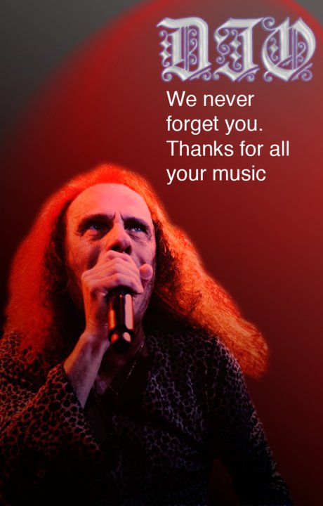 http://headlines.yahoo.co.jp/hl?a=20100517-00000410-reu-ent 彼を見たのは、78年の秋田県民会館でのレンボーのコンサートでした。 その時は、前日札幌で客がステージに殺到し将棋倒しになり尊い人の命が失われたばかりで、その日のお客さんより、警官の数の方が多かったのではないだろうか? 演奏メニューは前年度と変わりなく、評論家の間では非難轟々でしたが、俺たち、ハードロックを愛する秋田県人にとってはそりゃもう先を争ってチケットを何とか購入、冬の雪の降るさなか、車だったが、皆、胸をワクワクさせて秋田を目指しました。その中にはボボ沼沢氏もいました。 オープニングが子供が映画のワンシーンを思わせる様なテープが流れ、一曲目の”キルザキング”で始まりました。もう後ろの虹のネオンがクルクルとまるで遊園地のように輝き、もう会場は興奮の坩堝と化していました。時々興奮したお客が、ステージに駆け寄ると、悲しいかな警備員に取り押さえられ、席に戻されていました。そのつど、会場は笑いが沸き起こっていました。 更にリッチー!と言うか掛け声の中で、ただ一人「ブラックモア~!」と叫んだ人がいてこれまた会場は大爆笑でした。 内容は、コジーパウエルのハイピッチにチューニングされたドラムセットを叩き、実に解りやすいドラムソロ?と言いますか、基礎の出来てるドラムプレイは最後のツーバスをフルに活用した、ロールの連打は圧巻で、会場は興奮も絶好調にたっしました。 後リッチーのギターソロで前日亡くなった方への追悼の意味で即興演奏をやってくれて、もう言葉がありません。 ロニーは最初から最後まで自分の姿勢を崩すことなく、キッチっと歌い上げたと言う印象で、彼のVoはいくら周りの音がでかくても決してまじ交わらない、しかもちゃんとした存在感ある一つの柱のようでした。 彼のVoスタイルは、スコーピオンズのクラウスマイネやアイアンメイデンの2代目Voブルースディッキンソンなど色々なVoリストを語るには消して外す事など出来ないハードロックの金字塔を築き上と言っても過言ではないと思います。 合掌です。PS:俺がEバンドの頃、88年の大阪厚生年金会館の中ホールでのサウンドチェックの最中にある外人スタッフが見学に来ていました。それが何と、DIOのロードマネージャーで、お前達、うちのステージ見たいかと言われ、とことこと長い暗い廊下を通っていくと、そこ大ホールでステージに恐竜の首がセットされて中央に憧れの(Dr)ヴェニーアピスのセットが2m以上の高いところにセッティングされていて、「あ、あれ?」そこに何とその本人がセットに座りサウンドチェックをしてるではありませんか? もう俺は釘づけ状態で目を皿のようにして見ました。 あの力強い、スナップをきかせて叩く様は今でも忘れません。その時辻君はステージ袖にスタッフと話し込んでいる(G)ビビアンキャンベルにハーイ!と声をかけていました。何て軽いんだろ?と、そしてロニーは居ませんでしたが?その時のEのステージは多分ヴェニーアピスに負けじと叩いたかもしれませんね?