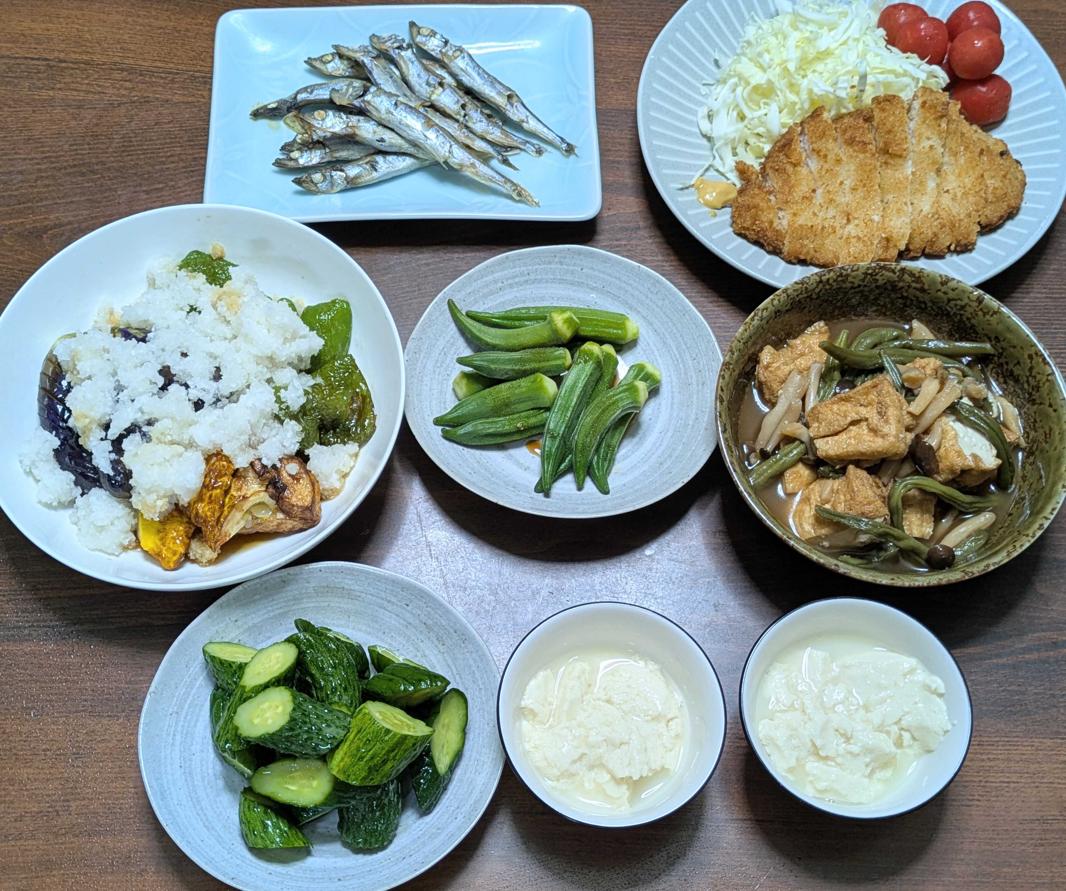 今日は大暑間違いなく暑いです37℃まで上がりました午後になって雷がゴロゴロこれは一雨来るのかなと、思ったけれど、ここら辺は降らずに終わっています午前中はカーブスと買い物午後は休憩と、変わらずの1日です**********昨夜のごはん食材の片づけを兼ねているので皿数は多いです(笑)手前はお豆腐屋さんの寄席豆腐 冷凍庫に眠っていたカツを揚げてシシャモを焼きました 茄子と黄色のズッキーニ、甘長シシトウの揚げびたし大根おろしをたっぷり乗せました厚揚げ、いんげん、しめじの煮物***********私の留守の間に出かけたらしくあれこれとまた買い物をしてきました(笑)お昼用のピザシラスと青のりたっぷりで、おいしかったです今は、こうしてお得なピザもスーパーで買えますね