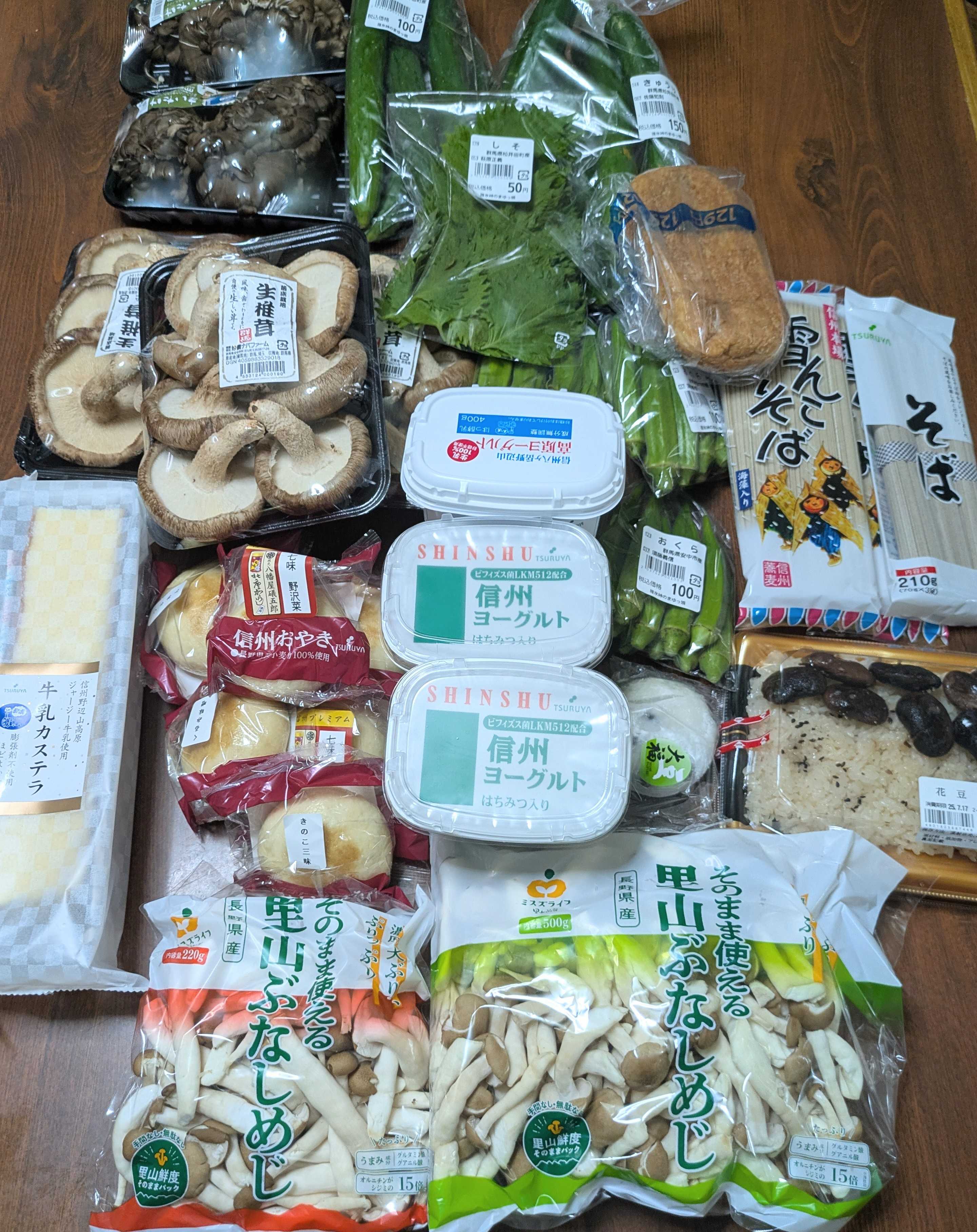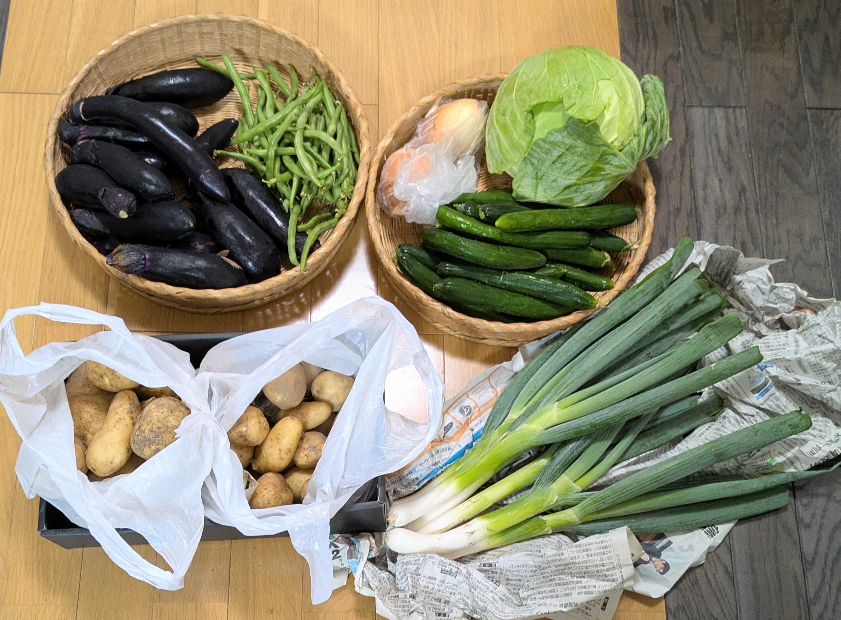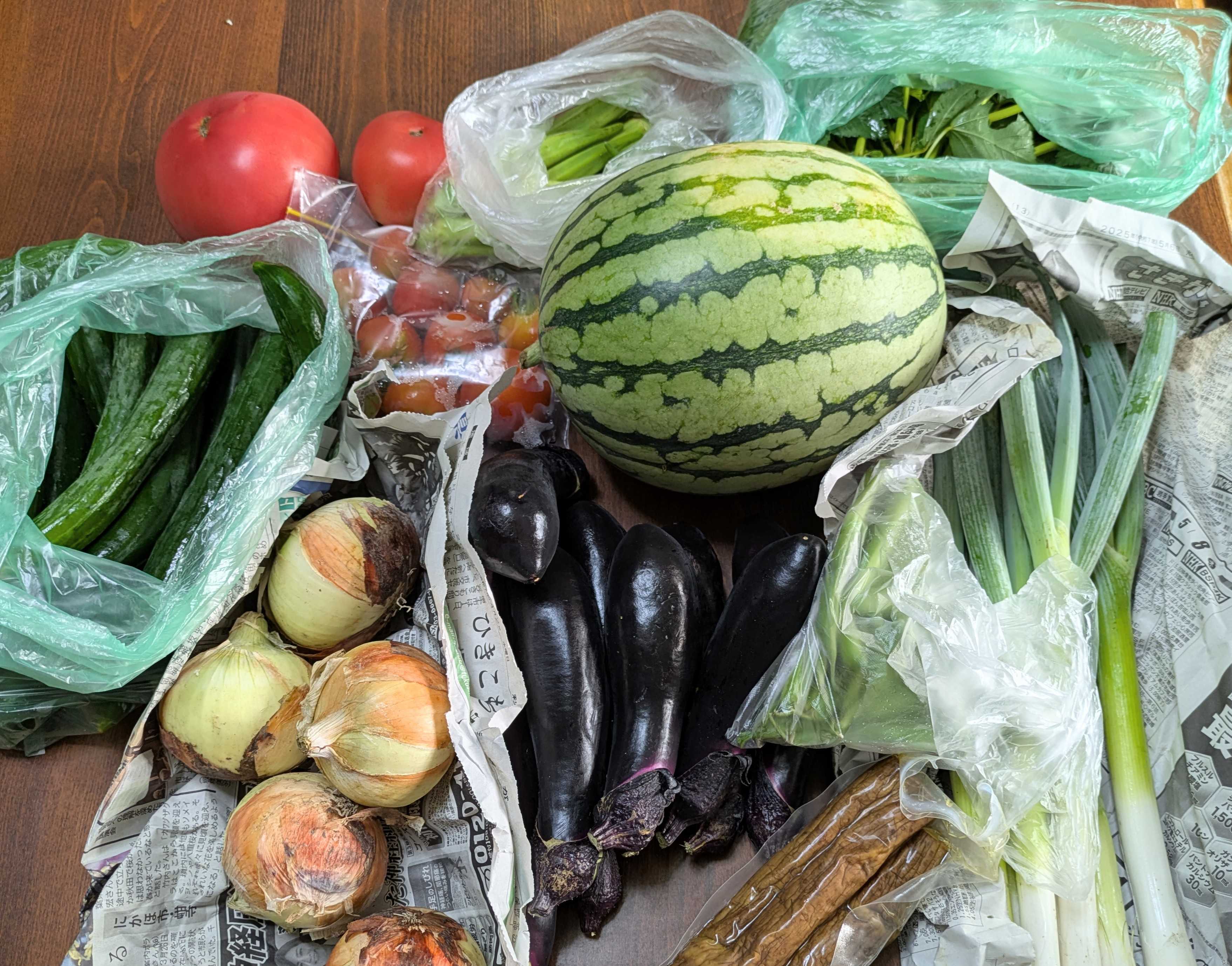 夫が、昨日帰宅しました向こうから帰る途中にあれこれと買ってくるのが楽しみらしいです(笑)色々ありますが軽井沢のツルヤさんのおやきやヨーグルト、カステラは孫たち用(笑)新鮮なキャベツ、レタス、ズッキーニは軽井沢の「みどりの広場」というJAの産直所でキズありトマトはラタトゥイユ用らしいです西瓜は孫のところと半分こしました15時過ぎに帰宅したのですが我が家の冷蔵庫に入りきらないので早々に孫のところにもっていってもらいました娘には前日野菜室を開けておくよう伝えてあったので持っていっても嫌がらず(笑)だったようです***********夕飯の生野菜軽井沢のレタス、秋田の胡瓜、例の宝箱のトマトタンパク質は生カツオ、豚肉とキャベツ、玉ねぎの蒸し煮ワカサギの唐揚げ(スーパーで買ったもの)茄子の辛子漬け、みそポテト、花豆のおこわも並べました種類を多く、1皿は少な目にと思うのですがたくさんの野菜を消費しなければなのでちょっと頭を悩ませますきのこ類はちょっと干してから冷凍庫に入れて胡瓜はお漬物に夫の好きなラタトゥイユは昨日のうちに仕込んで・・・どうにか野菜室に収めました~~~(笑)**********今日も33℃まで上がりました直射日光は、かなり厳しかったですねただ風があって自転車だと帽子が風で飛びそうになりましたそういう時は、なりふり構わず(笑)ラッシュガードパーカーのフードをかぶります(≧◇≦)