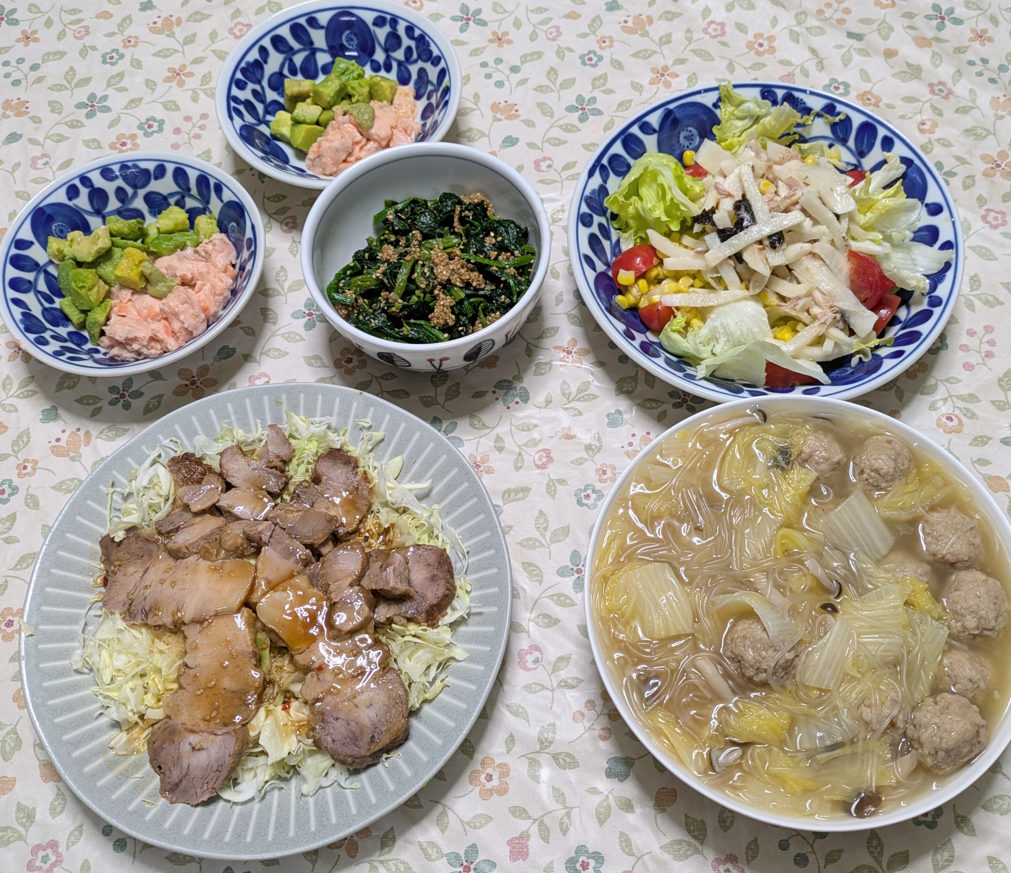 チャーシューに、白菜、春雨、肉団子、しめじの中華風