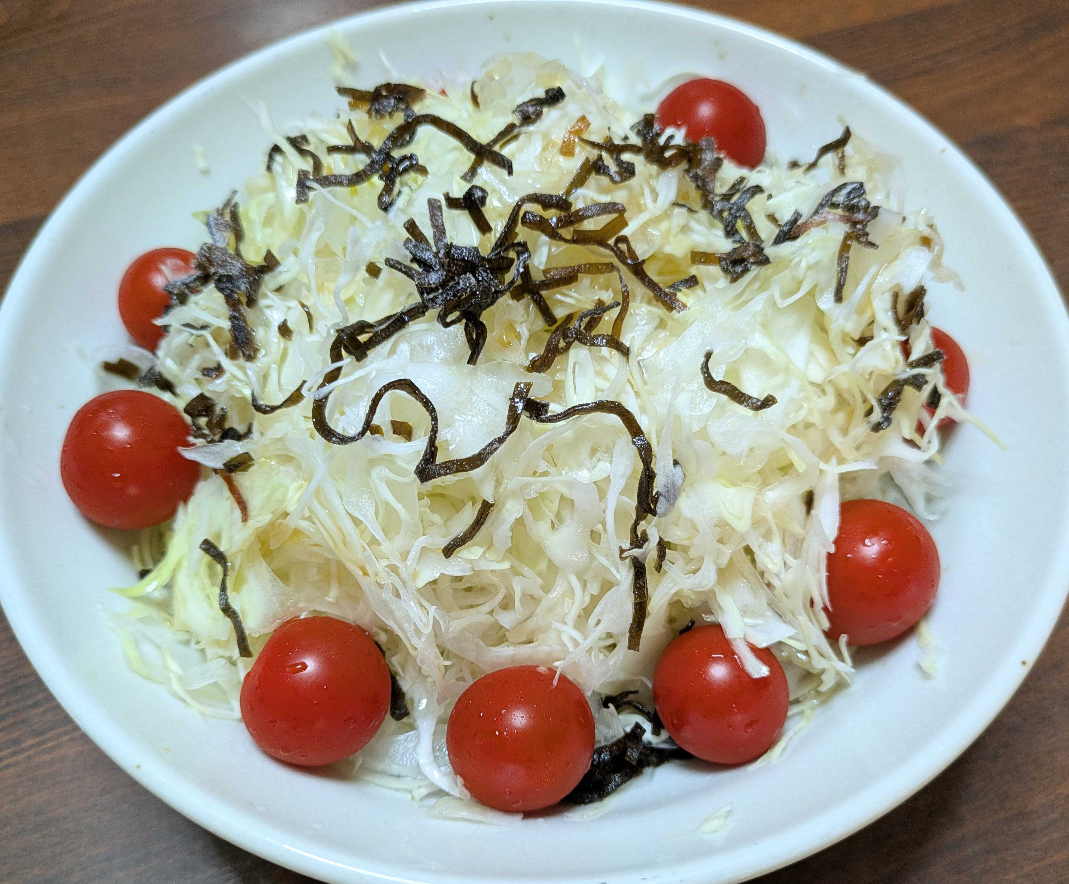 千切りキャベツは塩昆布とごま油でナムル風に味付け