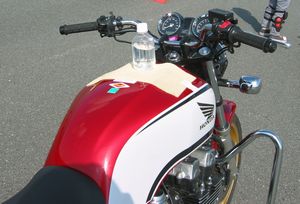 2年位前にSTECでも受講したが、レインボー浜名湖でも「ナイスミドル」コースが新設された。と言うことで、受講しました。STECの時は、結局通常のHMSと何ら変わらなかったので、今回もそのつもりで臨んだ訳ですが、N田イントラさんの理解は違っていたようで・・・。天気は回復傾向だが、家を出る直前まで雨が降っていた。レインボーに着いたら、コースの水掻きをイントラさん総出でやっていました。ご苦労様です。その横でS木イントラさんだけ、何やらゆっくりCB750で8の字書いています。???今日はレディースコースも併設のため、少し少なめの20名くらいでした。レベルによるコース分けはせず、あくまでも「ナイスミドル」ということで、「華麗に」とか「格好良く」とか言う言葉が飛び交っていました。始める頃には、晴れ間が見え始めました。最初は、普段なら受講者にお任せの乗車前点検についての説明から入ります。「ブタとう燃料」なる言葉から始まり、一通り説明の後乗車です。コースではまず、「格好良く乗るには、まず姿勢から」という言葉を元に乗車姿勢を説明。たまに聞くと、基本を思い出していい感じです。コースは、10mストパイ+オフセット。その後、ブレーキング+オフセットに。ここでO田イントラさんから、「まだ横に身体が動いて引き込もうとしている。それを腰からの回転にしてください。」と最近言われ続けている言葉をいただく。気を付けているつもりだが、できていない。で、昨日N田イントラさんから言われた「イン側のステップを踏んで、アウト側のひざでタンクを押さえる」(今日も言われてましたが)をやってみると、いい感じになってきた(と勝手に思う)。休憩後、8の字チームとパイスラチームに分かれる。もちろん、昨日の特別講習でN田さんの8の字を見たからには、8の字でしょ。で、やってみる。減速のブレーキと旋回のブレーキ。そして何もしない(アクセルの遊びを殺す)。と考えながらやってみる。途中、N田イントラ登場。一緒に回ってもらう。コメントは「身体が逃げてる(ゲッ、またなんちゃってリーンアウトだ)。」何周か前を走ってもらう。次に来た時は、「(旋回後)パイロンから遠いよ。1m~40cm離れている。最後はマフラーが掠る位でないと。もう少し前から旋回を始めたら。」と言うことで、もう少し早めに旋回を始め、パイロンぎりぎりを狙う。お昼休みにビデオを流してもらうが、正直画面が小さすぎて、自分がどれかわからなかった。もちろん、画面に近づけば良いのだが他の参加者の手前、自分だけ必死で見るもの憚られたので、食事中は見たが、その後は部屋の外に出た。でも、昨日のように自分の姿勢を客観的に見ることは殆どできないので、ダビング可能なら良いのになぁ、と思っています。最近はコンプライアンスや個人情報の類は非常にうるさいので、難しいとは思いますが。午後からは、まずUターンの練習。通常ならバランスコースのメニュー。低速で、発進後すぐにUターン。5mほどの道幅で、最後はフルロックと言われたが、できませんでした。バランスコースにも参加したいなぁ。その後、コーススラロームだが、ここでは2つ通常と違う設定となっている。1つは、コース内にターン用や区切り用だけではなく、パイロンが設置してある。S字の左右だったり、S字の中に寝ていたり、イントラさんいわく「通常のラインをつぶす様に置いてあります。」もう一つは、希望者のみバイクのタンクの上に滑り止めのマットを貼って、その上に水の入ったペットボトル(背の低いもの)を乗せて走る、というもの。 こんな感じ実際走ると、思ったより大丈夫。私の場合、特にスピードが遅いのもあって、ほとんど普通に走っても大丈夫。でも、4回中2回落としたけど・・・。ここでは、O田イントラさんから「こういうスピードの遅い時こそ、下半身で乗って見て下さい。上半身で引っ張り込んではだめ(だったかな?)。」というアドバイスを受けた。その後、下半身を意識するとOKが出た。見ててわかるのか、やっぱりイントラさんは凄い。前を引っ張ってもらうが、パイロンを気にしすぎで、スピードが全然でない。「こういうコースだと思って走ればよい」とイントラさんから言われるが、わかっているけどできませんでした。最後は、Jターンの練習。直線で3速までシフトアップして、その後減速、シフトダウンしオフセットに繋げる、というもの。うまくオフセットと繋がりません。イントラさんからも同様の指摘を受ける。気を付けます。が、基本的にカリカリ走る雰囲気ではないので、軽く流す感じで、走って終了です。ということで、走行距離は52kmほどでした。カリカリ走らない分、得られたこともあった気がします。たまにはこんな講習も良いかな。連休中は特別講習が、通常講習後にあるのですが、東名の渋滞が気になったので、申し訳なかったのですが、本日は聞かずに帰りました。本日は、UターンをスーパーイントラS木さんが実施し