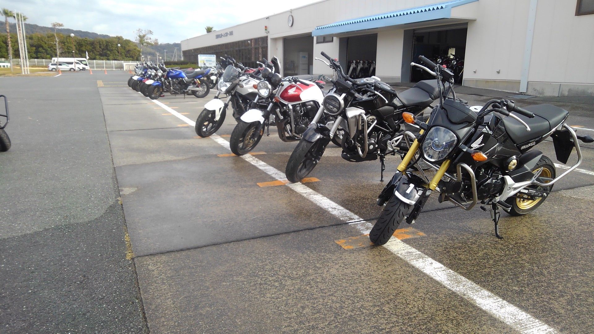 曇りがちですが、時折日も射す湖畔で1年9か月ぶりのバランススクールを受講してきました。 参加者は4名。 バイクはCB250R。 今日の参加者のバイクはNC750、CB400SF、GROMと全員違います。 イントラは、最近トラ車を2台買ったというK村さん。 併催は初中級とHDSでした。 まずは一本橋で実力を知るということで、朝一で測定です。 2本走り、結果は16秒とDNF(エンストからの転倒)でした。 まずはフラットのエリアで、少し前進して一瞬停止、その後また進む練習を繰り返します。 気が付いたのは、一瞬停止ができるということ。 バイクと相性がいいようです。 その後、ハンドルを切った状態で回り続ける練習。 ハンドルが真っ直ぐな状態でバランスする状態(バイクが直立)を確認後、ハンドルを左に切った状態でのバランス点を探すと、若干バイクは右に傾いた状態となる。 右に傾いたバイクとバランスを取るには、ライダーが若干左になる。 これが今までの自分のイメージと逆になり苦労しました。 今まで低速で大きく回ろうとすると、バンクをしてリーンアウトで半クラというイメージでしたので、慣れるまで時間が掛かりそうです。 午後からはパイロンを使ったコースを走ります。 3mと2mのストレートパイロンを低速で回ります。 ここでCB250Rはクランクシャフトのジャイロ効果も少なく、動きが軽いです。 そんなこんなで最後にまた一本橋を走りましたが、2本ともDNFでした。 一本橋になると、全然止まれません。 先は長いです。 次回は2週間後に中上級かな。
