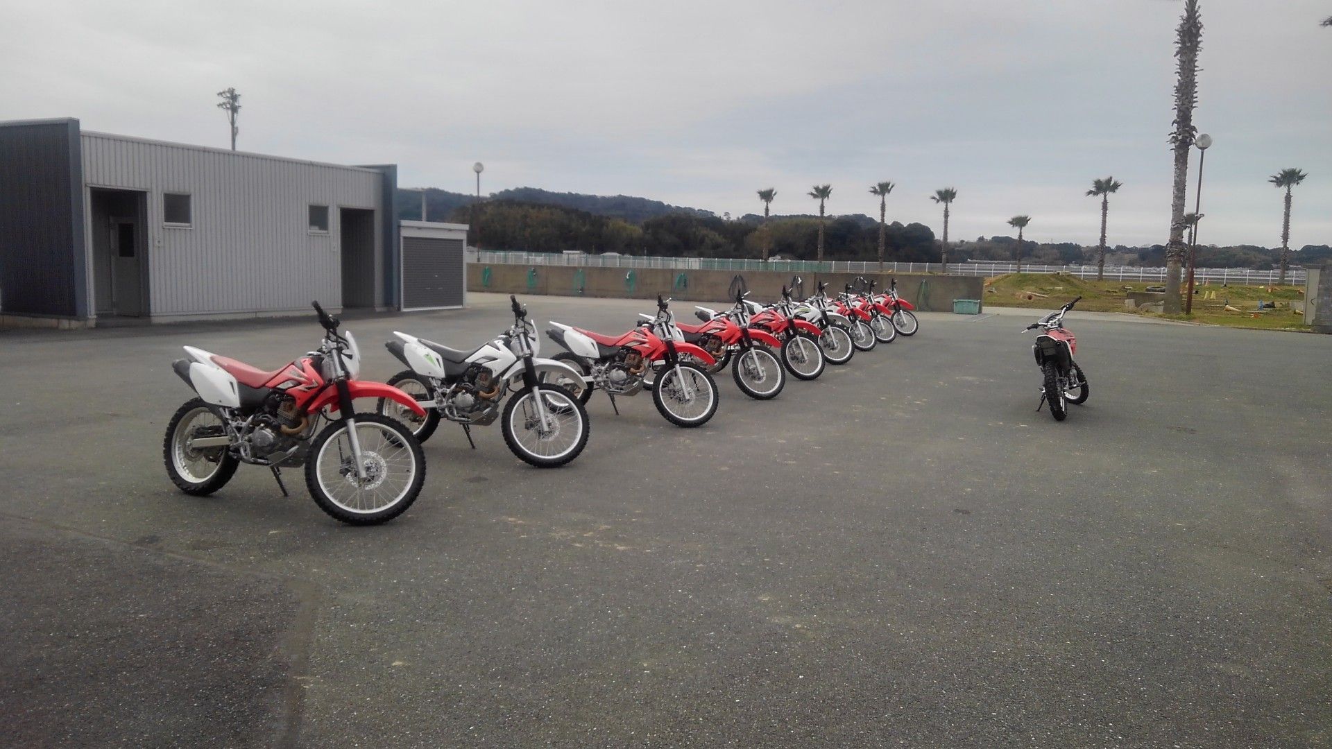 先週に続きHMSオフロード中級受講してきました。 参加者は8名。 イントラはW田さん。 天気は午後から雨予報と先週と同じ状況。 午前中はブレーキング+オフセットやフラットオフセットなどそれなりにグリップが良い状態で練習。 下半身でホールドする練習をしましたが、それを意識しすぎて体が前に言っていたのか、フロントが逃げる感じがする。 案の定、フロントからスリップダウンして転倒しました。 午後からはまず8の字で前後位置を確かめながら走行しましたが、また転倒。 それでもなんとかフロントに乗り過ぎる感じは回避できる感じになりましたが、そのころには結構雨が降っていて、ズルズルと滑り出し始めていました。 最後の2タームはコーススラでしたが、普通にグリップ走行をしようとしてもカウンターを当てている感じでした。 何とか最後までは立っていられました。 次は来週オン上級です。