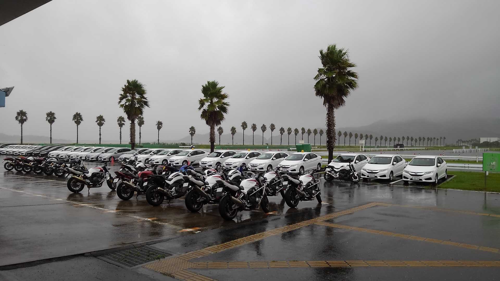 8の字の練習成果を発揮すべく中上級に参加しました。もちろんバイクは1300ですが、タイヤはそれなりに使われているもの。参加者は12名。イントラは8の字と同じN村さん+K賀さん(だったかな)。天候は午前中は結構な雨でしたが、午後は小雨でした。今日のテーマは「雨だからフルロック」らしいです。フルロックするとバイクが立つので、加速に移行しやすいところが狙いのようです。細かいオフセット中心に練習です。最初は減速しながらハンドルから手を放し、少し傾けることでハンドルが勝手に切れる感覚を掴みます。その後、しっかりハンドルロックを意識して走ります。少しはできるようになりましたが、8の字で練習した左ターンでの重心の下げる感じは今一歩です。コーススラを走りましたが、少し傾けてアクセルを開けるだけで、ズルっと行きます。細かいターンでは今日練習したようにフルロックさせることで、バイクが起きることで加速しやすくするのも雨の日では一つの手段という事もご指導がありました。最後のタームでも細かいターンの練習では、結構つながりよく走れるように感じました。パイロンをしっかり回りきるまで後輪を前に送り込む意識が功を奏してしるようです。N村さんからも以前より回り込めているとお褒めの言葉をいただきました。50kmほど走りました。これで連休特練は終了です。次回は2週間後にオフ中の予定です。