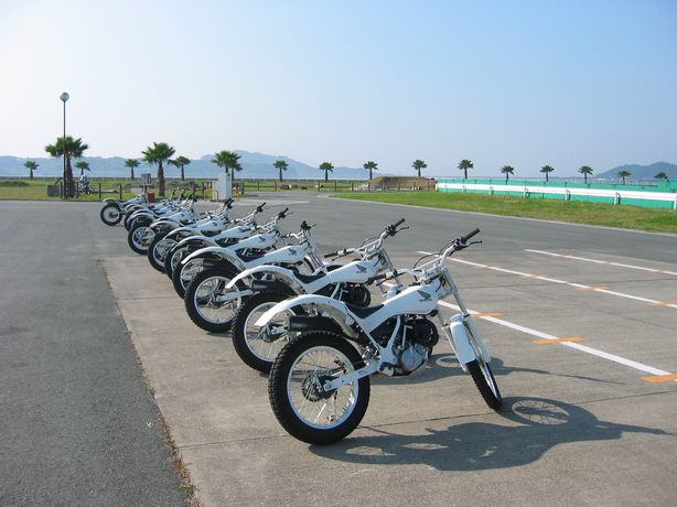初めてトライアル入門を受講しました。 朝の浜名湖非常にいい天気でした。夕方からは崩れるという天気予報でしたが、1日晴れで倒れそうでした。(というより何回も転倒はしましたが)本日はトライアル入門しかコースが開講していないので、コース全体を使ってウォームアップです。その後、湖側の草むらを使って8の字。ここでリーンアウトで回るのだが、すでに転倒とエンストを何度となく繰り返す。が、しかし、TLM220はキックスタート。全然エンジンをかける事が出来ません。これは1日辛いことになったのですが、終了頃には10発くらい蹴るとかかるようになりました。休憩をはさんで、オフロードコースで小山を越える練習。体重を前後に移動させて走行。ここでは転倒しなかったものの、その後低速コースにある斜面をキャンバー走行しているときに、バイクを傾けすぎ、転倒。バイクとコンクリートの面で足をはさみ、身体をひねる格好になってしまい、左のふくらはぎが攣ってしまい、私の午前中の練習はそこで終了となりました。午後からはエンジンを切ってスタンディングスチルの練習。3秒くらいしかできません。その後、エンジンをかけて同様に止まる練習。すぐにエンストして、キックの嵐。ここでもイントラさんにかけてもらう。最後はセクション走行。S字、Uターン、連続Uターンの初級編と小山ありの上級編があり、まず初級編のクリアを目指す。ガチガチながら何回か繰り返すうちに、何とかクリアできた。その後、低いギャップを越える練習をする。その一環でフロントアップを練習するが、全然上がりません。途中で体重移動方法を教えてもらい、フロントが浮き出した。でもすでに体力は限界に近く、終了間際フロンと浮かして、そのまま転倒しました。それを機会に本日の練習は終了となりました。 最後に転倒したエリアすでに今の時点で、体の節々が痛み出しています。明日の朝起きれるか不安です。今日、何回か転倒し、他の参加者やイントラさんにはご心配をおかけしました。ここで改めて、お礼を伝えたいと思います。ありがとうございました。
