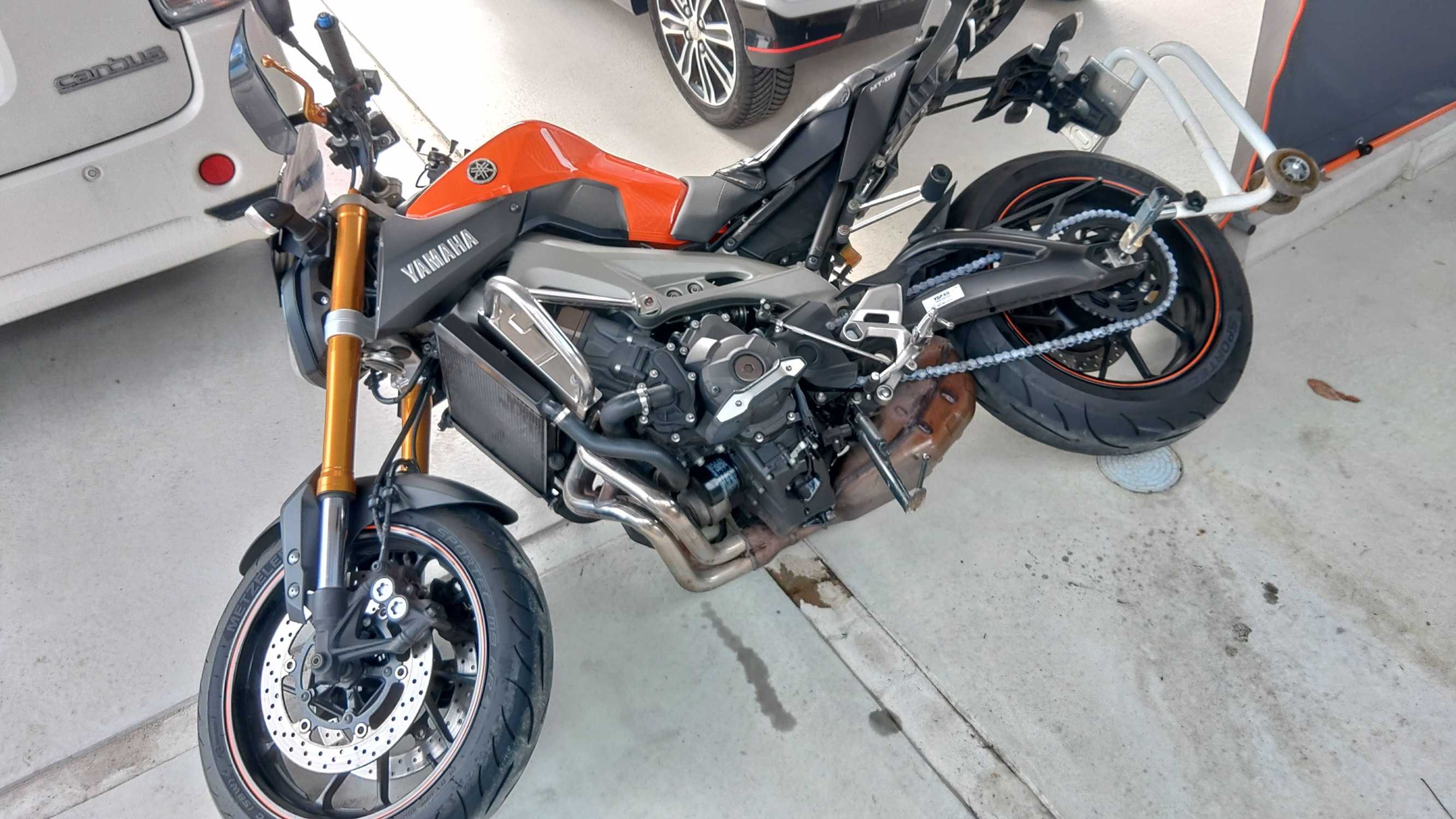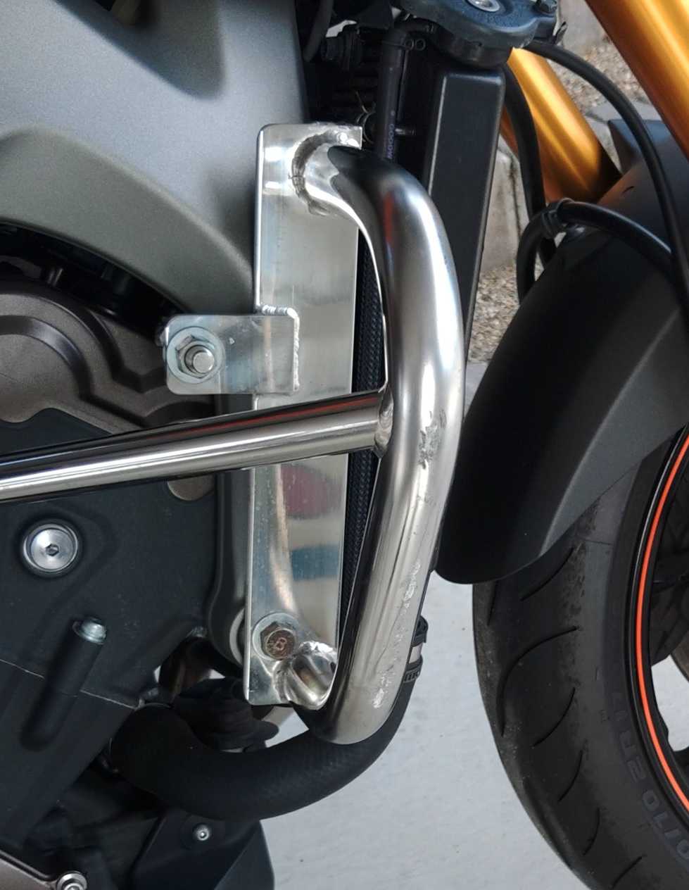 で、元々サイドスタンドしかないバイクなので、レーシングスタンド(後輪用)を一人で付け外しをするのですが、今回初めてまたがらずに外してみたらバランスを崩して、見事右側に倒してしまいました。