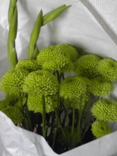 今日会社で小さな花束を頂きました毎週月曜日はお花屋さんが会社に飾ってあるお花を交換する日なんです社長のお宅にも季節の花束を持ってくるので今日は私にも半分だけおすそわけ仕事中は給湯室のバケツにちょっと放置 なんだか緑ばっかりだな~と思っていたら色とりどりのお花が入っていましたお花を生けるセンスは全くありませんが どうでしょう バックがグチャグチャで恥ずかしい~ ピンクのカーネーションです 緑の菊もいいですね~これ一番好き これは何 たまには 切り花を生けるのもいいですね あり合わせ弁当
