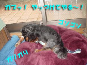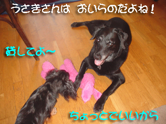 こんにちわ 大雨すごかったですね~ 今日はやっと晴れ間が見えますが 降ったり止んだりで 公園の土が乾かないので お散歩ではどろんこになってちょっと困ります・・・ やっぱり短足ダックスしかもロングは 不利ですよね~ さて 週末雨が降ってる間 我が家ではこんなことが・・・ (日本昔話風に) むか~し、むか~し あるところに黒いお爺さんが住んでおったとさ。 お婆さんが川で洗濯した うさぎさんをもらって お爺さんはご機嫌そのものじゃった どこからともなく 現れた地を這うようにして歩く悪の童 お爺さんが大切そうに手でおさえているうさぎさんを 何が何でも奪おうとするのじゃった・・・ 気の優しいお爺さんは、しつこい悪の童にお手上げ お婆さんに助けを求めますが とうとう うさぎさんを悪の童にとられてしまいます。 奪っておいて、おいかけて来ないのを不満に思う悪の童。 その顔は邪悪そのものじゃ・・・ 可愛そうなお爺さんを 不憫に思ったお婆さんめでたしめでたし 「お年寄りは座布団が好き」というお話 ではなく 童の悪の数々を そのままオテント様は見過ごすことなく 悪の童をこらしめるために 雷を落としたそうな 悪いことばっかりしてる童も さすがに雷様には恐れ入り あわてて抱っこ袋に隠れる始末 めでたしめでたし 「悪い子のおへそは雷様が頂くぞ」というよくあるお話 ではなく 抱っこ袋が大好きなおまけ 次に生まれる時は必ずカンガルーになるそうな・・・ という 輪廻転生のお話でした 三度目のめでたしめでたし 今度こそおしまい もうイヤ~ 坊や~よい子だ寝んねしな~