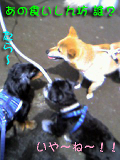 こんばんわ今日は珍しくまともに仕事してしまった普段さぼってるから たまには仕事しないとねと言いながら本日の出勤は ちょっと遅め何故なら 久しぶりのわんこ集会へ参加しなくて 出勤なんかできるか~久しぶり太陽さんのおでましに おまけは 超ハイテンション公園へ向かう時は・・・どうにも止まらないおまけはこちらおまけ短足の割に足がけっこう速くて 画像がおいついてません先を急ぐ おまけには 止まれのサインは見えませんそして 公園についてからは久しぶりに会うお友達と大盛り上がり匂いを嗅いだり一緒に走ったりレスリングしたりって言うのが 正しいわんこ集会というもの・・・でも 我が家のちょっと間があいただけで 内弁慶に戻りまくって遠慮がちなおまけ・・・かなり腰がひけてますそして 何故か 帰ろうとする飼い主さんを道路でまでひきとめる あいつ・・・どうにもとまらない あいつの食い気あいつにとっては 公園が食堂なのではなくどこでも食堂・・・(どらえも~ん よろしく!)しかも どこでも無銭飲食・・・(皆さ~ん ごちそうさまで~す!)親の私の恥ずかしさも とどまることなし・・・すっかり遅くなってしまったので皆さんのところには土曜日にお邪魔しま~す!