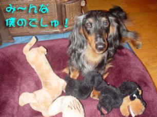 東京は どよよ~んなお天気でネタもないな~と思っていたところへ tsmarineさんからバトンタッチするたびに変化するバトンを受け取りました いろんなバトンがあるけど、毎回最初に考える人はすごいな~って思います ルール 1~3は、バトンを回してくれた人の質問に答える 4は、次に回す人への質問を考える 5は、バトンを回してくれた人へメッセージ 6は、次に回す人3人をご指名(1) ワンちゃんと出会ったときのことをおしえてください 「おいらとママさんとの出会い」(by Leon) ママさんはその日、会社の元上司とラーメンを食べに行くところだったのに お母さん犬のおっぱいを吸っている僕ら兄弟を見てしまったらしい・・・ もともと一人暮らしをやめて実家に戻ったばかりのママさん、ばぁばとじぃじと 大型犬を飼う話で盛り上がっていたとか・・・ ママさんストーカーのように窓にはりついておいらをじ~っとみつめて、 ラーメンのことも上司のことも忘れて 中に入って来た! 窓にはりついてる時からおいらもなんとなく気になってたから おいらお母さんのおっぱいやめて走り寄ってったんだ その瞬間のことをママさんは今でも覚えてるって言うんだけど、 おいらはよくわかんない・・・ ママさんとおいらの恋の始まりだね くっくっくっ 早速次の日にやってきて、おいらのお母さんの飼い主さん(たまたま訓練士)と 必ずその人のところで訓練を受けさせるという約束のもと、 おいらを連れて帰ったのさ それがおいらとママさんの出会い、以来おいらはずーっとこの9年間 アホでドジなママさんと愉快に暮らしてる・・・ そうそう訓練だけど、ママさん訓練士さんと大喧嘩して1週間で退会 おいらにとってはそれはそれはラッキーだったよ ベイビーレオンはお盆に乗れた!いえいえレオンが大きくなったのさ! 「僕はママの子でちゅ」(by Enzo) お正月で暇で行くところないからって大晦日の日に 僕が閉じ込められてるペットショップにやって来たママとばぁば お正月もお休みしないそのショップで僕は売れ残りとして 誰にも相手にされず、うんPまみれで狭いところに閉じ込められた いっつもお腹すいてたよ ガリガリで他の子と比べて全然しいたげられてる僕を見て ばぁばが「この子安いのね~・・・なんだかかわいそうだわ」って言って ママが「かわいいかわいい顔じゃないところが いいね」って言って その夜 ばぁばとママは お兄ちゃんの年齢のこともいろいろ話合って 2006年のお正月に僕を あの狭いところから救出してくれたんだ ばぁばいわく「戌年のお正月に我が家に来た子、きっと福をもたらすよ」 えへへ、僕なんだかとっても嬉しくって狭いところから出た途端 ショップ中を走り回って・・・・店員さんに怒られちゃった トリミングとかサービスしますよって言われたらしいけど ママは2度とそのショップには行かないって決めたらしいんだ 僕そんなママが大好き・・・今ではすっかりぷくぷくのデカチュアダックスパピーの頃から日向ぼっこ大好き (2) ワンちゃんが毎日食べているごはんをおしえてください 基本的にはドライフードが中心だけど、 ☆ピピ Uゝェ・`U リン☆さんからワンコご飯の本を頂いてからは お休みの日にはあれこれ作るようになりました。 最近はドットワンのスープをつかってのワンコご飯にはまってます 写真は普段のお食事 大きさの違いが笑えるでしょ (3) パパさんorママさんにとって○○ちゃんとは?ずばり 何よりも大事 あいつは私のことを恋人だと思ってると思う・・・ いざという時は守ってくれるし、いつもそばにいてくれて 誰よりも私の心の動きを理解してくれます・・・ ちょっとヤキモチ焼きだけどね おまけはうちに来てからあっという間に やんちゃな弟の立場を確立して あっという間にショップでの記憶を消したらしく もしかしたら私を本当にお母さんと思ってるみたいなところがある・・・ というか私が この子産んだかも?って思える瞬間がある この子たちなしの人生なんて考えられない (4) 次の友達への3つの質問 1 ワンちゃん、ワンちゃん達のこれだけはヤメテな変な癖を教えてください 2 ワンちゃん、ワンちゃん達のテーマ・ソングを教えて下さい (替え歌・CMソング・ワンちゃんが反応する歌とか奇声とか) 3 ワンちゃん、ワンちゃん達との忘れられない思い出を教えて下さい (5)tsmarineさんへ 毎回質問が変わる楽しいバトンをありがとう マリンちゃんはすっごいかわいくて、いつも写真を見るのを 楽しみにしてるよ tsmarineさんとは名古屋弁で会話できるのも、楽しくていかんわ とろ~い親子な私たちとこれからも仲良くしてやってちょ 我が家には男の子しかいないから、マリンちゃんのワンピ姿も楽しみだけど もうすぐママになるのが今はとっても楽しみです マリンちゃんのベイビーはきっとマリンちゃんに似てとってもかわいいと思う 今からワクワクドキドキだと思うけど、tsmarineさんも体調に気をつけてね (6) 次の方。。。CoCoのんさん・ばにちゃんずさん ・さ
