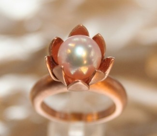 今年、出版記念で発売しました蓮の花の指輪「サラスヴァティー」の、14金ピンクゴールドの特注バージョンの写真です。この写真の指輪は、14金ピンクゴールド、鑑別書付きの花珠(アコヤ真珠の中でも真珠層が分厚い最高級のもの)で、特注です。もともとシルバーで企画しましたが、オプションで、14金ホワイトゴールドでもお作りしました。その後、ある彫刻家の方からのオーダーがあり、「ピンクゴールドで作ったら絶対かわいい!」とおっしゃっていただき、特注してくださいました。それで、ピンク色がより強く出る14金ピンクゴールドでお作りしてみたら、とっても可愛い指輪になりました。この彫刻家の方は、日本で多摩美を出た後、イタリアの美大に留学して卒業なさった経歴がある方で、本格派です。その方が、「真珠は好きなのだけど、今まで欲しいと思った真珠の指輪がなかった。あなたのこの指輪は初めて”欲しい”と思った素敵なデザインです。」とおっしゃってくださいました!これは、私もお客様も、とっても嬉しいですね☆プロの美術家の方のお気に入りの指輪となり、嬉しさ倍増です☆彫刻家ということは、ジュエリーは彫刻が小さくなったようなもので、ほとんど同業者なのに、私の指輪をお選びいただき、アーティスト冥利につきます☆その後、この彫刻家の特注オーダーがきっかけで、この可愛いピンクゴールド版が欲しい方々がたくさんでてきたので、順番にお作りしている最中です。(他のシルバー、ホワイトゴールドなど、仕上がっていますのでまた順番に発送いたしますね。)お好きなホワイトゴールド、ピンクゴールド、鑑別書付き花珠、天然のブルーの真珠(まだま)でも特注でこの指輪を製作していますので、お気軽にお尋ねくださいませ。オプションで対応しています。ありがとうございます☆