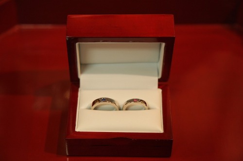 前回書き込みました、結婚指輪の写真を掲載します。このお写真は、お客様の神前式の前に、カメラマンの方が撮影したものだそうです。(掲載の許可をいただきました。)ありがとうございます。りングの仕上がりサイズは、新郎様のものは幅4.81mm X 厚さ2.5mm、新婦様のものは幅3.85mm X 厚さ2.43mmです。ブルーサファイアと、ピンクサファイアを一粒ずつ、埋め込みました。宝石に光が通るように、宝石をセットする前にリングに穴を貫通させました。プラチナ製です。全て私の手作りです。せっかくのオーダーメイドの結婚指輪なので、幅を広めに、分厚くして、がっしりどっしりと、ゴージャスにプラチナをふんだんに使ってお作りしました。プラチナは他の金属での作業よりも、磨きを何度も何度もやらなければピカピカに輝かないので、磨き作業が長時間になります。宝石のセッティングはストーンセッター(業者)にやってもらいました。私のジュエリーをお選びくださって、ありがとうございます。光栄です。感謝いたします。