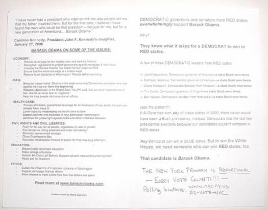 スーパーチューズデー当日に、ニューヨークのストリートで配っていて、いただいた、オバマの政策などが書いてあるプリントもまだ大事に持っています。