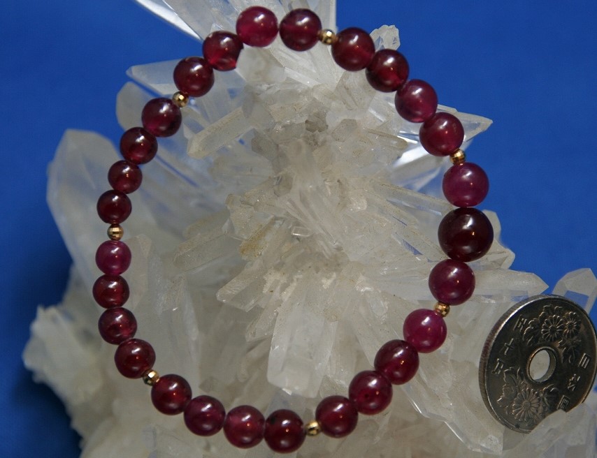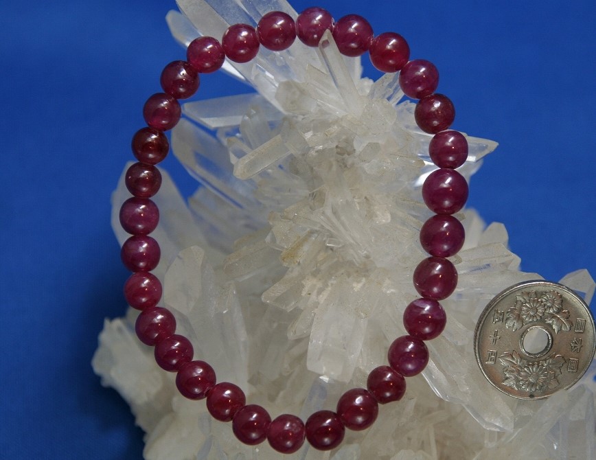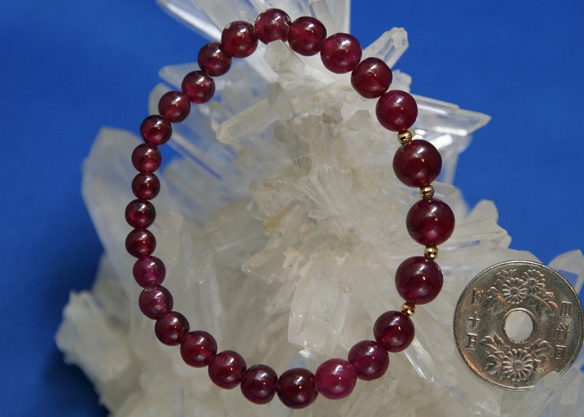 ミャンマー(ビルマ)産ルビーは現在ではほとんど入手困難なので、このような大粒で大量の宝石質ルビーのブレスレットとしてはなかなか入手出来ないクラスのものです。これはルビーのビーズとしては最高級です。