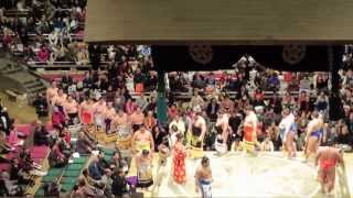 1/22雪の予想に反してお天気に恵まれた中、 両国国技館に、 「大相撲一月場所」を見に行ってきました。 都営地下鉄「両国」駅で下車、 江戸東京博物館前の駐車場を通って、無料の 「旧安田庭園」を散策。 庭園内の池の畔は、風もなくベンチに座ると気持ちがいい~。 隣の、「両国国技館」に入場してから、正面2階の お食事処「雷電」で味噌ラーメンなどを 食べてから、相撲観戦しました。