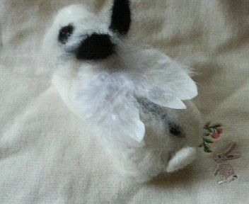 うさフェスで、お友達にプレするうさぎさんのオーダーを頂きました。お月様に帰ったので、天使の羽をつけてほしいとのこと。天使なこてつ君。 そして、愛兎ちゃんのオーダーもいただきました。爆睡メリ男くん。ありがとうございました。 11月30日、山口でうさぎのイベントが行なわれます。うさぎ工房 ~Bunny Tail~も参加させていただきます。展示はあるけど、商品として、実際に手にとってもらっての販売は初めて。ドキドキですっ。今回は、うさ好きが集まって始めたお店です。イベント終了後に、みんなのお店もOPEN予定です。オリジナルプリントバック・レターセット・ステッカー和柄の小物・羊毛うさぎ・うさ柄バックうさぎのハーネス等、みなさん素敵な作品ばかりです。今回は、羊毛では、小物を出す予定です。今、お店でも販売してる、ウッドピンチ。そして、新作のブローチ。そして、羊毛ではなく、ネックレスにも挑戦っ!!山口の近くにお住まいの方、月末は是非ラビット・ハートのイベントへっ!!いけない方は、イベント終了後のネットショップへのご来店をお待ちしています。 羊毛うさぎ、販売しています。 ↓ ↓ ↓