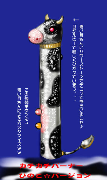 かちかちバーナーを開発している時の単なるジョークの1つだったこの記事に載せた青い月さんのつくった広告チラシ?にあったhttp://plaza.rakuten.co.jp/californiajade/diary/200910290000/人気デザイナーひのこ☆先生の洗練されたデザイン、初回限定田吾作カバーが・・・・ついに実現 笑 !!いやこのインパクト!これ、絵だけじゃなくて、ひのこ☆さんの誕生日用に、とちゅまがノリノリでまずちゃんと牛仕様のかちかちバーナーのカバーをつくりましてん♪そこに、さらにかちかちバーナーのオリジナルのデザイナーである青い月さんが「デコ電」ならぬ「デコかちかちバーナー」にしてくれたとかで 笑これさぁ・・・・腰につけてて転んだりしたら角んとこが当たって痛くね?ってじぇいど♪がちゅまにぼそっと言ったら、ちゃーんとそこんとこ、考慮してあるとかで押すと角んところ、ちゃんとカシャっと引っ込むのですと。なんとう凝りようwwwモノ造り大好き人間2人の合作に加え、それをまたこんなにリアルな手のかかった絵にわざわざしてちゃったひのこ☆さん 笑クリエイティブな世界ちゅうのには、こういう「無駄な遊び心」ってのはきっと欠かせない部分なんだろうなあ、と、この3人のモノを作ったり絵にしたりってときの「わくわくかげん」「入れ込み具合のアツさ」を見ててあらためて思ったのでしたヽ( ´ー)ノちなみに、そのひのこ☆さん、先ごろmixiのコミュl'accademia mineraleの管理人さんになられたのですが。ひのこ☆さんの企画によるウエサクの満月にちなんだイベントが2つあるようです。5月27・28日の夜l'accademia minerale で音楽祭が。http://mixi.jp/view_event.pl?id=53136490&comment_count=19&comm_id=3736386そしてコミュLand通信のほうでは『ウエサク満月の音と光と祈りの宵 』が26・27・28日の夜http://mixi.jp/view_event.pl?id=53167010&comment_count=27&comm_id=3867099開かれるとのこと。要チェック!