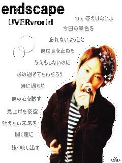 endscape / UVERworldねぇ答えはないよ 今日の景色を忘れない様にと 僕は息を止めるんだ昔の経験に足を取られて 在りもしない壁を自分で作ってたんだ大事にしすぎると壊れていきそうでかけがえない物を作るのが怖かった僕たちはこの世界に永く生き過ぎたのかなねぇ答えはないよ 今日の景色を忘れない様にと 僕は息を止めた与えもしないのに求めすぎていたんだろう時に過ちが僕の心を試す見上げた夜空 叶えたい未来を 開く瞳に強く映し出す昔の自分に 偶然逢って あの頃を思い出してたんだ明日を浮かべながら 寝静まった町のベランダから見る景色は同じなのに生きるほどに見えなくなる 素直な本当の気持ちが綺麗な物ばっか並べても悲しくなるだけだったねぇ足りない物を 嘆くだけの僕らは創ろうとはせず 膝を抱えてるだけでこの先になりたい 自分を描いたら今するべきことが見えるから太陽の呼ぶ声に 目が覚めた 昨日の赤い海を飲み干して青に変えて行くキラキラ光る時間の針の上風に逆らう雲を 明日の自分に重ねて行く遮るものが 多すぎるんだよここに立ってるだけじゃきっとねぇ答えはないよ 今日の景色を忘れない様にと僕は息を止めた与えもしないのに求め過ぎていたんだろう時に過ちが僕の心を試す5年先 なりたい 自分を描いたら今するべきことが見えてくるだろ見上げた夜空 叶えたい未来を 開く瞳に強く映し出す≪画像クリックでPV見れます≫