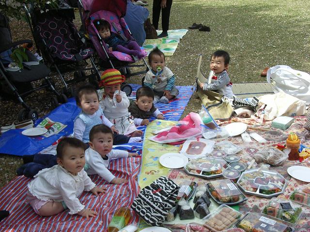 なんだか忙しい1週間だったー、…気がする。月曜日はあおいちゃんちに遊びに行った。あんよが上手でびっくり!この間まで赤ちゃん赤ちゃんしてたのにちょっぴりおねいさん風になってた。もう今月で1歳になるし時がたつのはやはり早いねー。で、火曜日は延期になってたお花見が決行された☆天気も良くてかなり気持ちよかった!11時に高島屋ベビー休憩室集合(で、ハナ&リラ微妙に出遅れる)の後、デパ地下にて食料調達☆(←これには間に合った!)集まったのは8組のママ&ベビーで、新宿御苑まで群れをなして(行列つくって)ゾロゾロとバギーがゆく光景はちょっと注目集めてたゾ。場所を確保し乾杯前(ハナ含むママ数名酒持参・フィクションってことで)に記念撮影☆ちなみにリラはどこにいるかっつーと、ピンクのベビーカーに寝起きのふてくされ顔(またもやワッキー顔なの!?)がそうです。みんな、かわゆいなぁ。また次回は5月予定♪おまけ=「ふ~、やっとアップできました。」