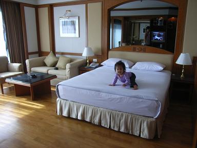 今回の旅での心配事のひとつに「リラの食事」ということがあった。特にベビーフードじゃなきゃいけないわけではないのだが、タイでの食事はコージでさえ腹を壊すことがある。リラは危険だろ~。。前回はバンコクの空気だけで目ヤニがすごかったし。(ちなみに今回は、目薬を処方してもらい持っていったが、まったく目ヤニはでなかった。成長したから?こうして少しずつ「ヨゴレ」になってくんだねぇ。うぇっへっへー。)以前書いた気もするが、リラはベビーフードをほとんど食べない。レトルトとか、そのまま捨てるはめになる。(バチが当たるぞ!)しかし、今回はやむを得ずわこちゃんのイラスト入りの12ヶ月用のレトルトを数食分買って持っていった。ところで、今回はホテルでなく、メオタイさんにちょっと知恵を借りた結果、サービスアパートメントに滞在することにした。センターポイントというバンコクにはあちこちにあるサービスアパートメントのひとつでペッブリ ソイ15を選んだ。キッチン付きだし、電子レンジもトースターもある。これで、軽くリラの食事を暖められた。うれしいことにDVDやVCDも見れる!リラが退屈してしまった時のために大好きなDVDをポータブルプレイヤーごと(飛行機に便利♪)持ってきていた!リラの食事の話に戻るが、実際にレトルトはまったくと言っていいほど食べなかった。何を主に食べていたかと言うと。。おやつの赤ちゃんせんべいとクッキー少々、そして何より…DVDを見ながら大声をあげ、ノリノリでバーガーキングのフライドポテトをむさぼっていた。よい10ヶ月児はマネしないでほしい。今回、めんどくさがってあまり利用しなかったがプールもきれいだった。開放的なプールの脇にジャグジーもあった。