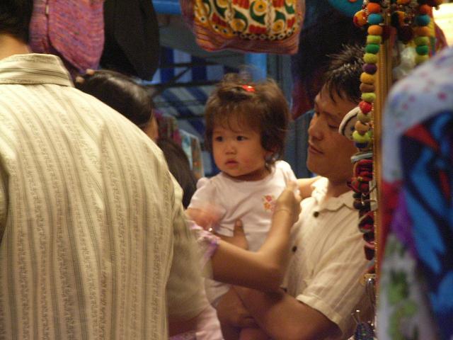 ところで、ハナたちはバンコクにただ遊びに行っているわけじゃない。メインは店の商品の仕入れである。リラは特に仕入れなんておもしろくないだろうが、お留守番というわけにいかないのでもちろん同伴する。今回の旅でさらにリラは営業が上手になった。リラはほとんど人見知りのようなものはないのだけど、時にはちょっと心配になる。まぁ、人の顔見るなり泣きまくるよりいいんだろうけど、誰にでも抱っこされようとする。ハナとコージは商品を選んでるときなんかは大助かりだけど、さすがに余裕こいて連れ去られでもしたら大変と、結局仕事に集中はできない。でも、そんな母の心配もよそにリラも知り合いのスタッフも楽しそうにしている♪心配の前には微笑ましいかな☆(微笑みの国タイ)で、仕事も落ち着きハナはカオサンで前髪をブレイズしてもらおうと思って道端で交渉し始めた。路地の奥にサンプルになる写真や、エクステンションのヘアの色などを見に行ったりして、コージにリラを押し付け道端ヘアサロンでイスに腰掛けた。コージはパッタイなんかを食べ始めたが、リラはいよいよ退屈でご機嫌斜めに…。『ごめんね。かぁちゃんのワガママだね』なんてベビーカーに座ったリラをあやしながら髪をいじられていたらヘアサロン(?)のボス的存在のマダムがリラを抱き上げてくれた。リラのご機嫌はとりあえず保たれたが、ハナとしては頭を動かすことができないのでリラの姿を追うことができず心配でしょうがなかった。とても優しいマダムだったが、初対面の人間であり顔を知っているいつものスタッフではないので、さすがに見えないところまで連れて行かれるのは不安なんてもんじゃない。恐ろしい。パッタイを呑気に食ってるコージは遠巻きに見守っているが、ハナは信用ならず『リラの隣に行って来い!!』とコージをあごで指図。しかし、それこそハナの心配なんてソッチノケで冷房の効いた涼しいタトゥーのお部屋でのびのびと楽しそうに遊んでいた^^;かなり快適で超楽しそうに遊んでもらっていた。そうそう。リラはこの旅行中に歯が1本見えたんだよね。。今はやっと下2本の上に4本目が出た☆それからワンワンとニャンニャンをわかるようになって今日は一生懸命『ワンワン』『ナンナン』を連発していた。